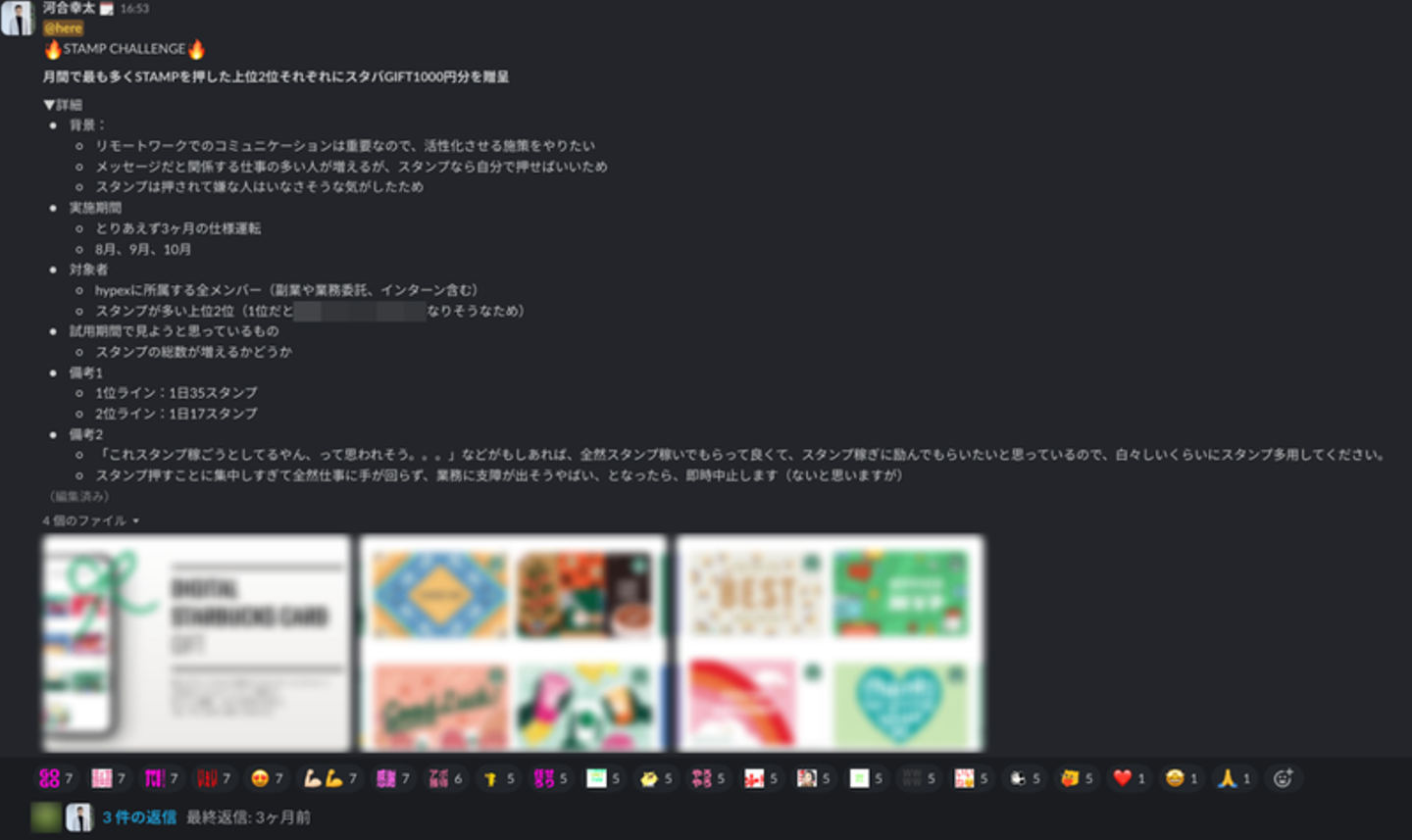 hypexでも以前はフルリモートならではの課題を感じていました。そのため今年8月から、試験的に「Slackスタンプチャレンジ」という施策をスタート。結果的に、社内コミュニケーションを大幅に活性化できました!(と、僕は感じています)