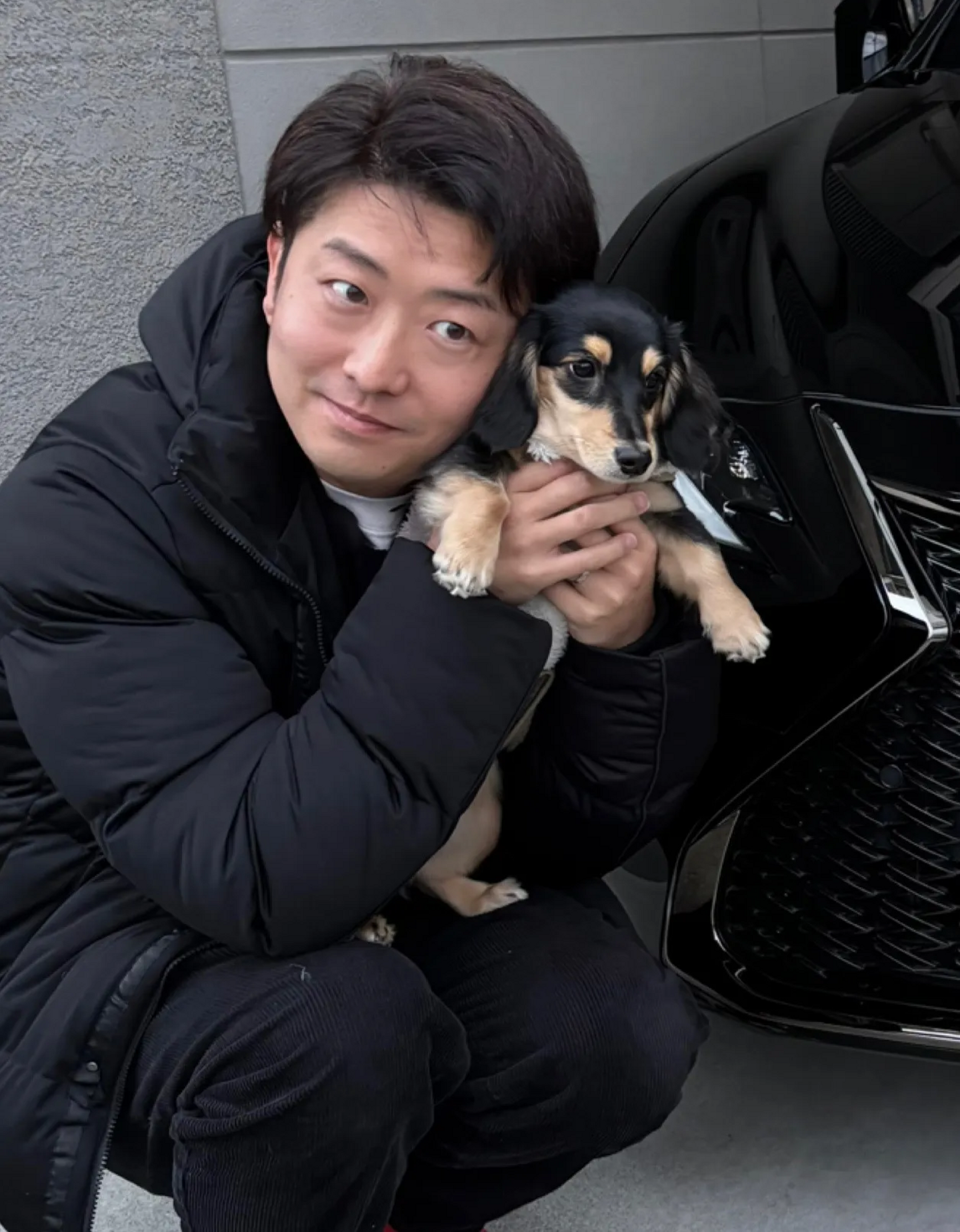 🔼 ペットのココアちゃんを抱える幸司さん