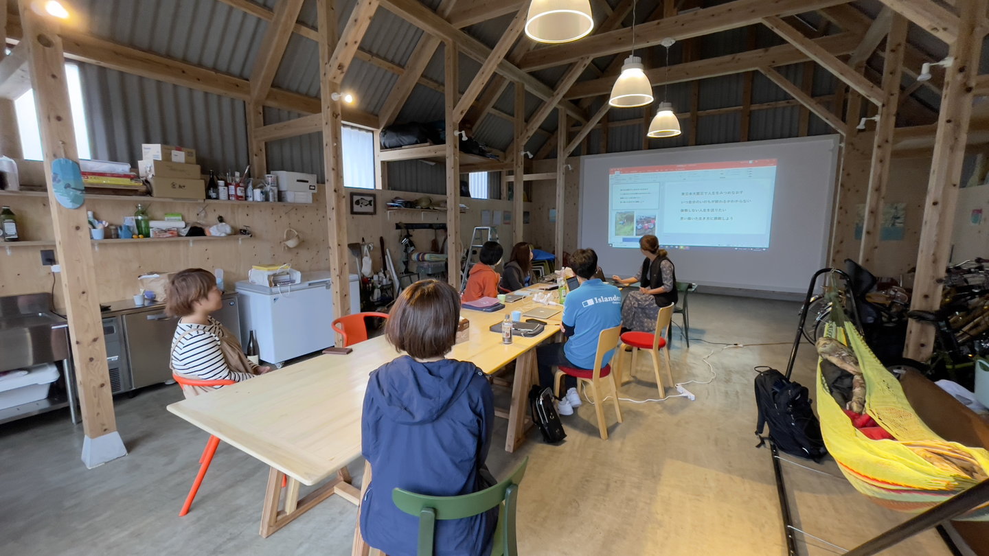 今回は壱岐と五島で1名ずつの入社がありましたので、いつもお世話になっている壱岐のゲストハウスのスペースをお借りして入社式を実施しました!