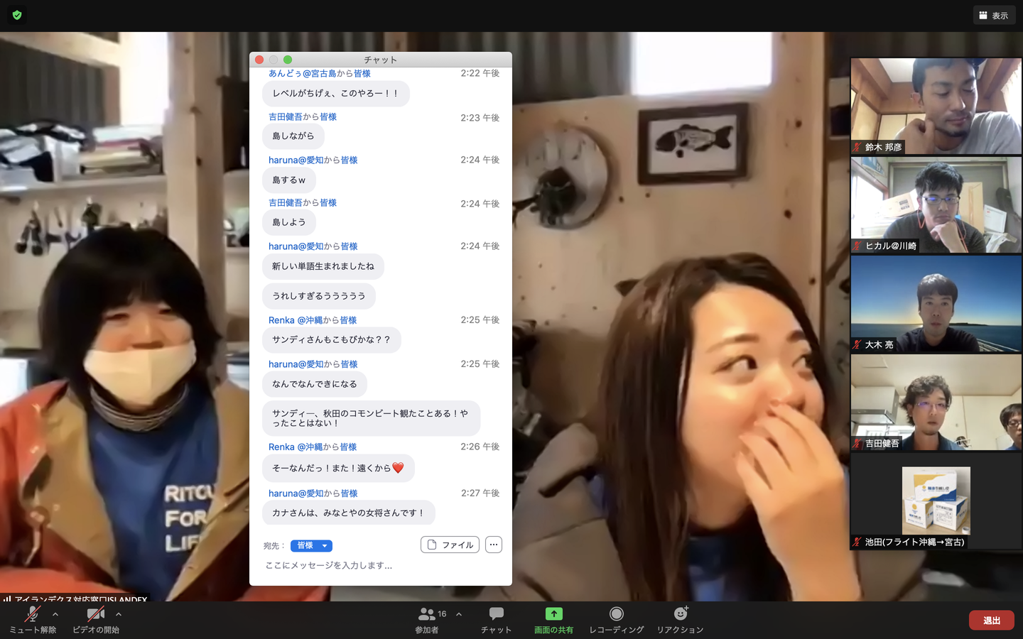 オンライン参加の方々も過半数以上いるので、このようにチャットが盛り上がったり。