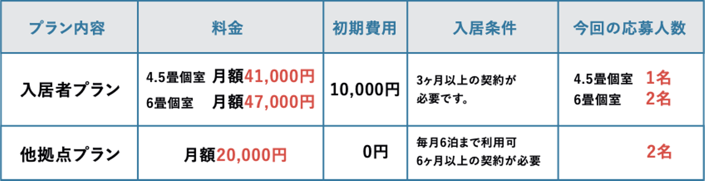 - ・入居者プラン:シェアハウスに通常通り入居するメンバー向けのプラン