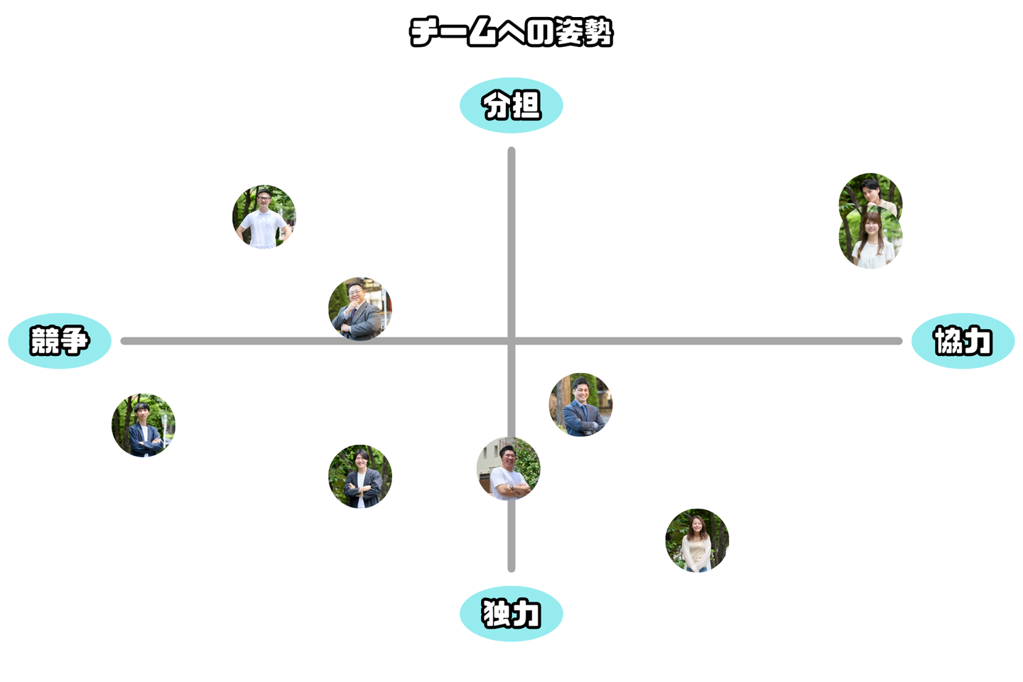 どちらかといえば、自分にタスクに集中し、持ち味を発揮する「独力軸」に偏っていますね。また、成果を競い合う「競争軸」にいるメンバーが多い傾向。
