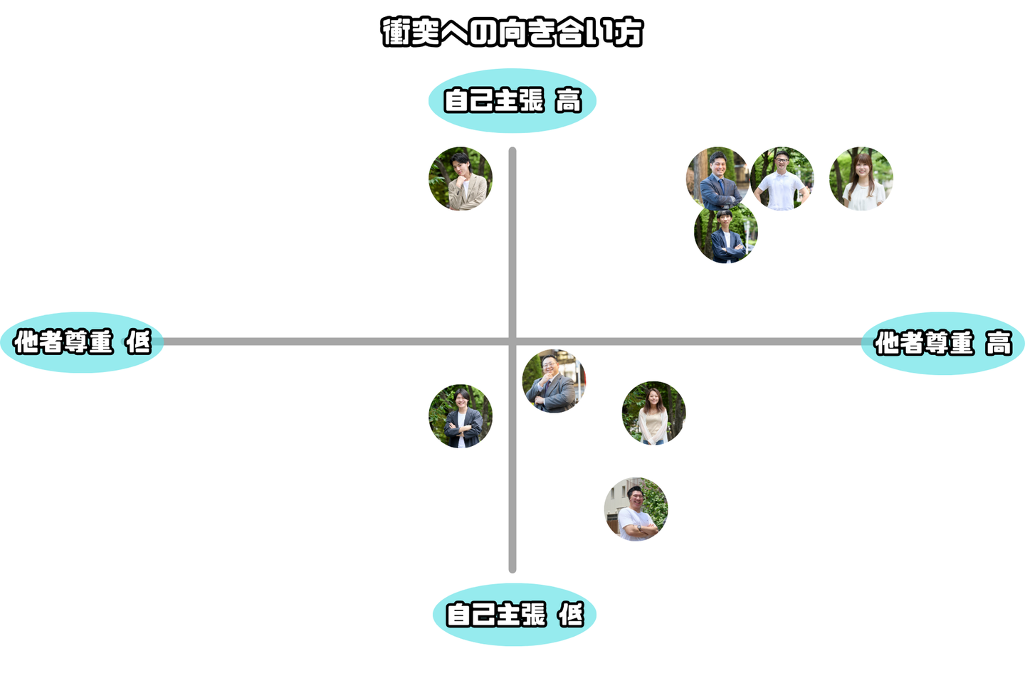 先程とは打って変わり、自己主張をしっかりしつつも、他者を尊重する社員が優勢に。その一方で、なるべく摩擦を無くし、衝突した相手との関係性維持に努める社員も約半数います。