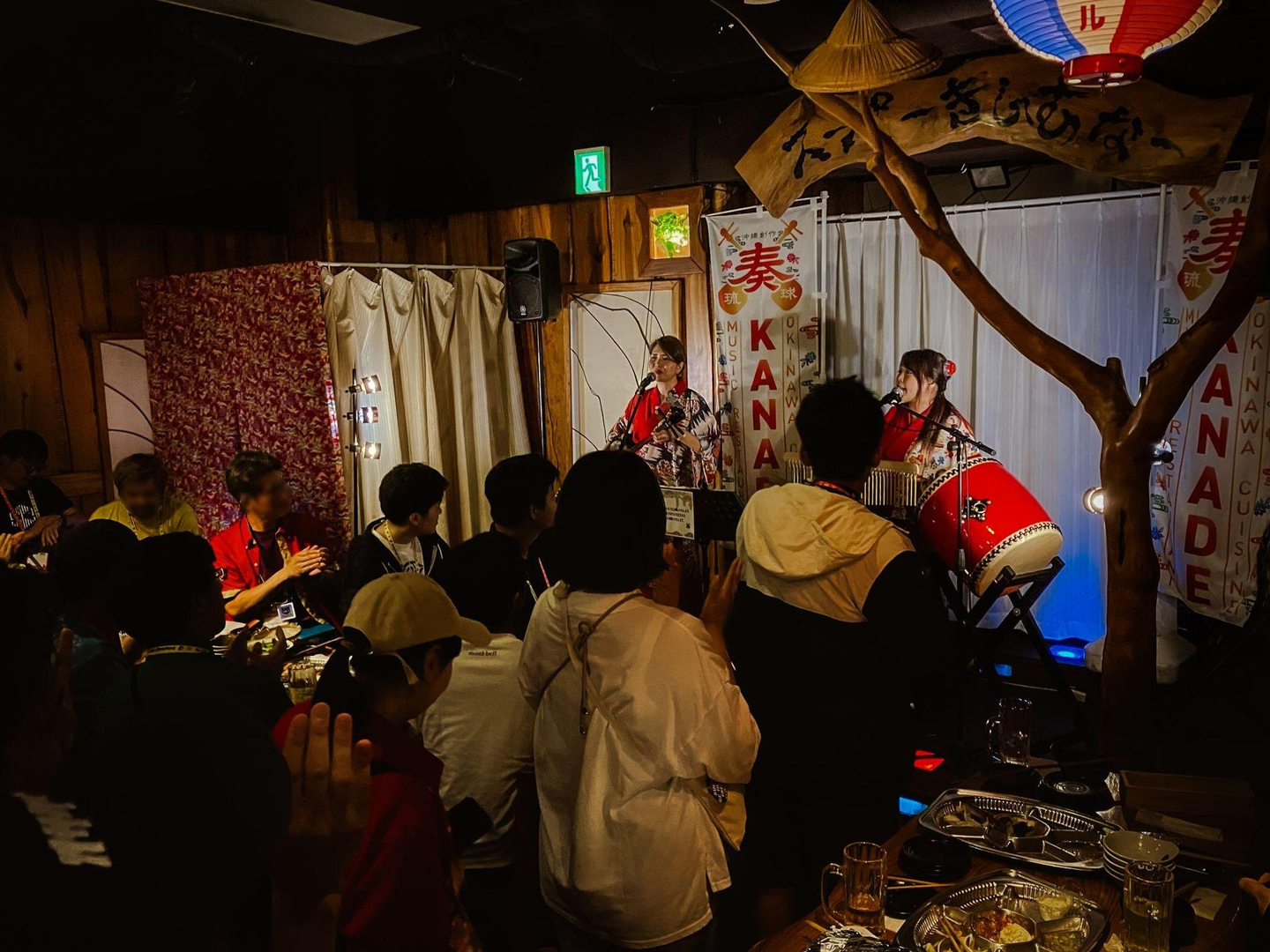 宴もたけなわな頃を見計らい、会場のステージにて沖縄民謡のライブパフォーマンスを行っていただきました。伝統的な沖縄民謡でしっとり...と思いきや、沖縄文化になじみの薄い方にも盛り上がって頂けるように、沖縄ポップスをうまくアレンジしたアップテンポな曲で来場者の心を鷲掴み。さらにコール&レスポンスで畳み掛け、会場のボルテージはあっという間に最高潮に達しました。