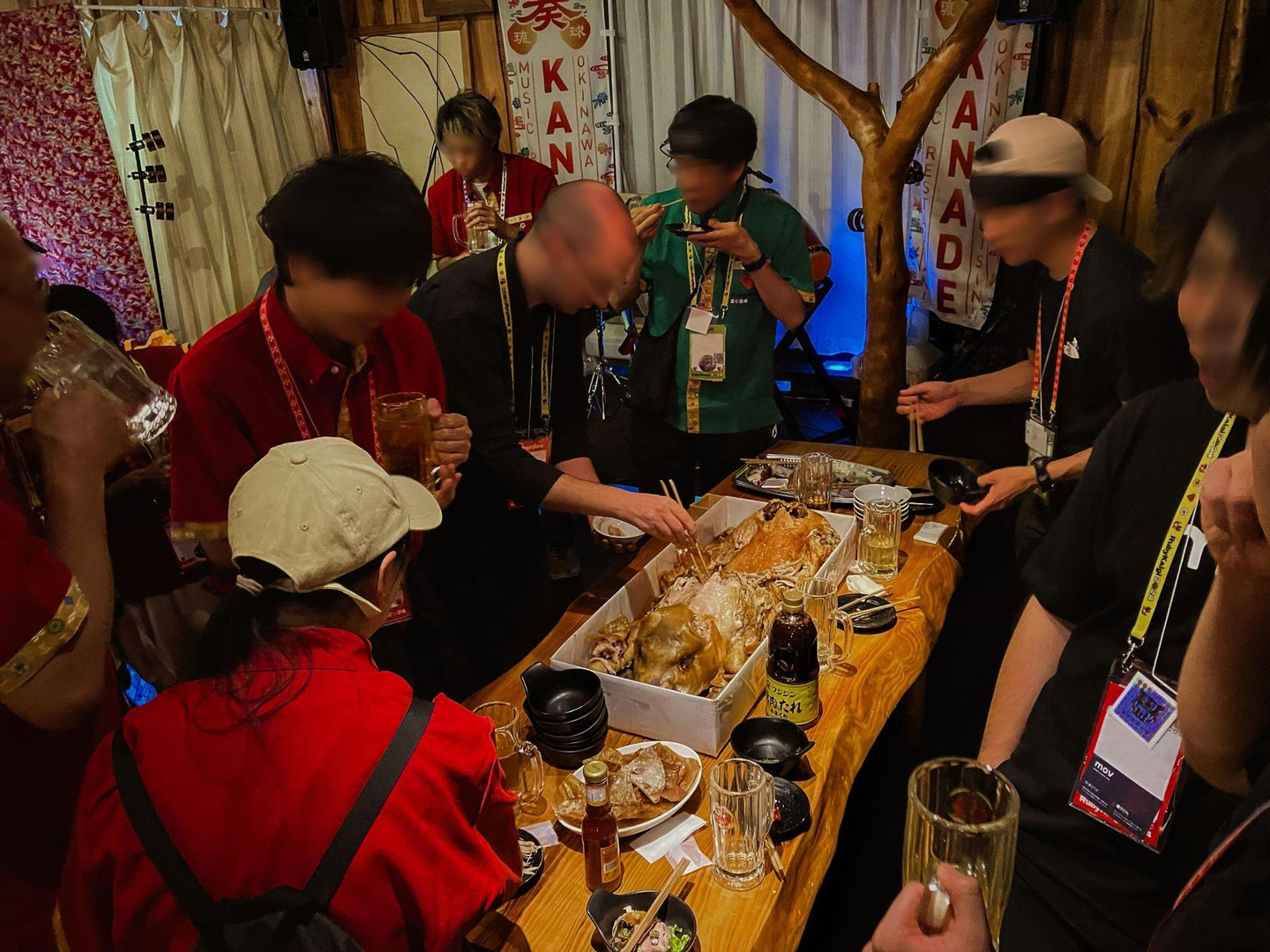 DrinkUpイベントは、那覇市の国際通りにある「沖縄民謡ライブ居酒屋・奏(かなで)」さんを会場として貸し切り行いました。1日中RubyKaigi会場を歩いて腹ペコのRubyistの皆さんに、ちゃんぷるーをはじめとする沖縄郷土料理を、美味しいお酒とともに存分に楽しんでいただきました。ちゅらデータならではのおもてなしとして、ちゅらデータ・エンジニアとイタリアンシェフの二足のわらじを履く異色の経歴を持つsueさんが真心こめて作った洋食のオードブルも振る舞われました。当日は、アメリカ・ドイツ・台湾といった海外からのお客様もご来場でしたので、バリエーション豊かな料理にご満足されたご様子です。ある意味ちゃんぷるー(ごちゃまぜ)文化の沖縄らしいおもてなしが出来たかなと思います。