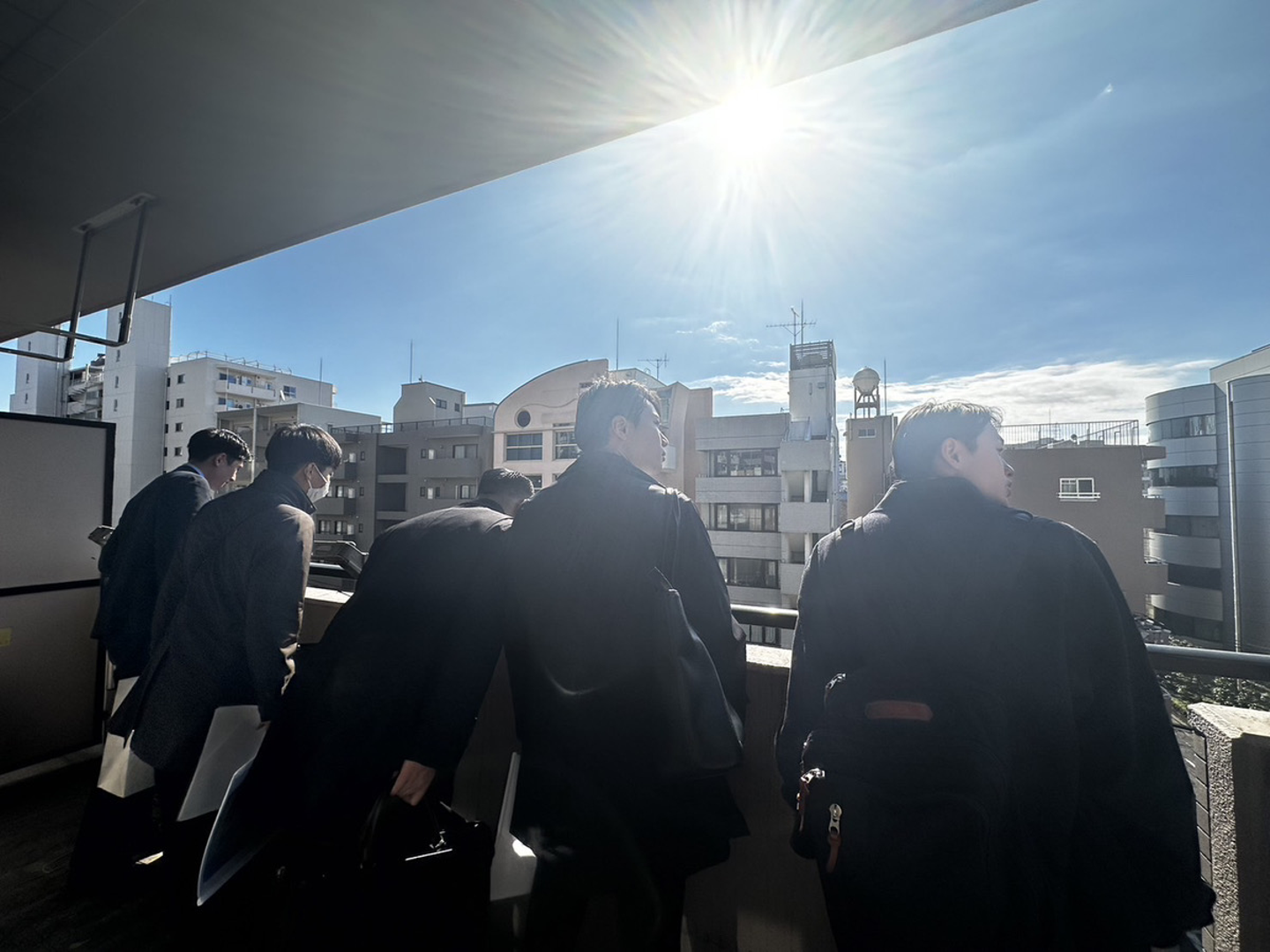 バルコニーから目黒川を一望し、「すげ〜」と呟く24卒メンバー。