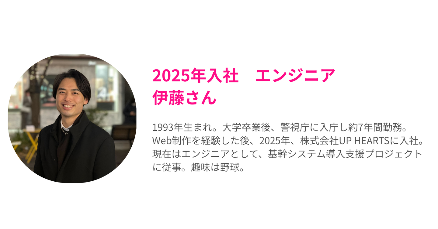 その想いを胸に、7年間勤めた警察官というキャリアに終止符を打ち、未経験のIT業界へ転職した異色の経歴を持つエンジニアが、UP HEARTSにいます。