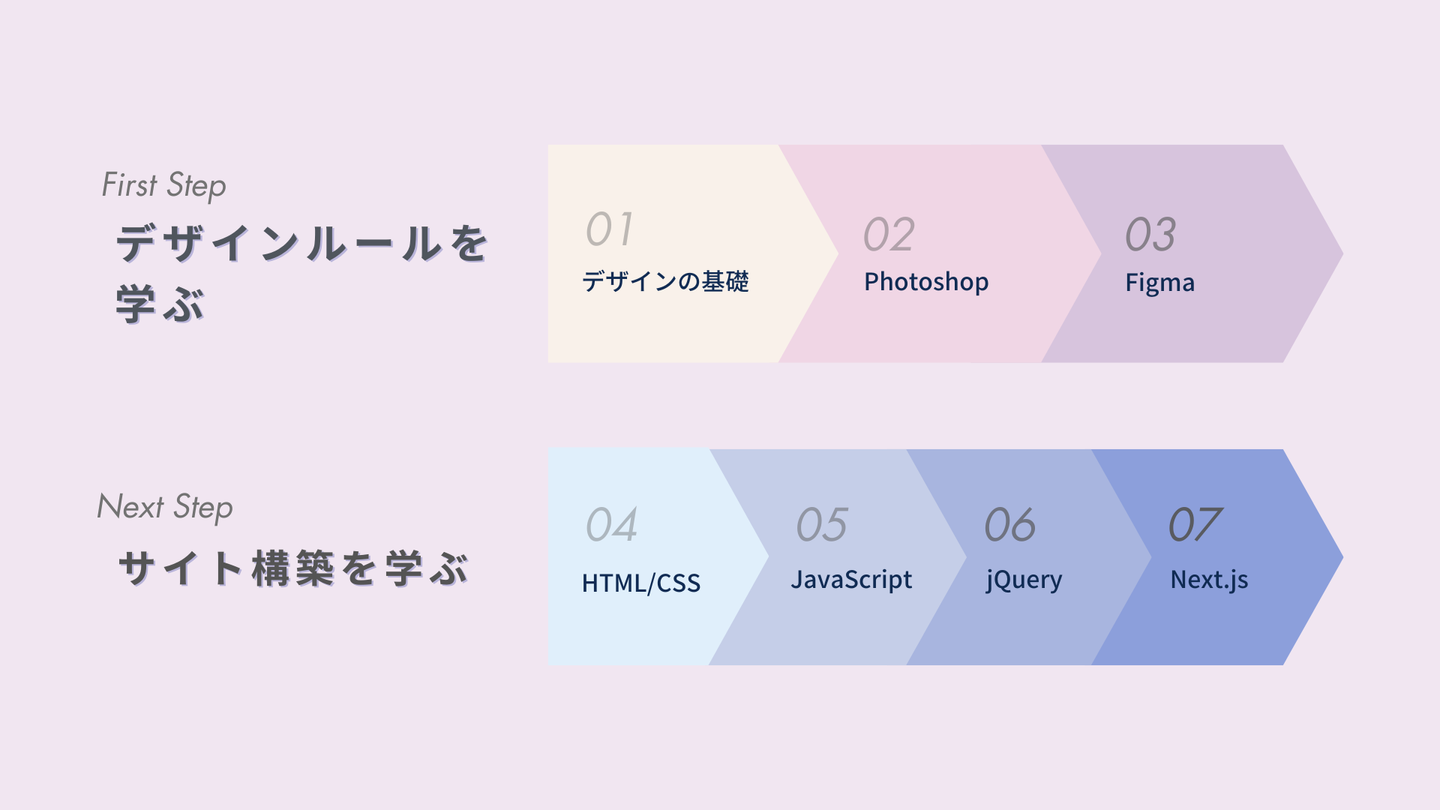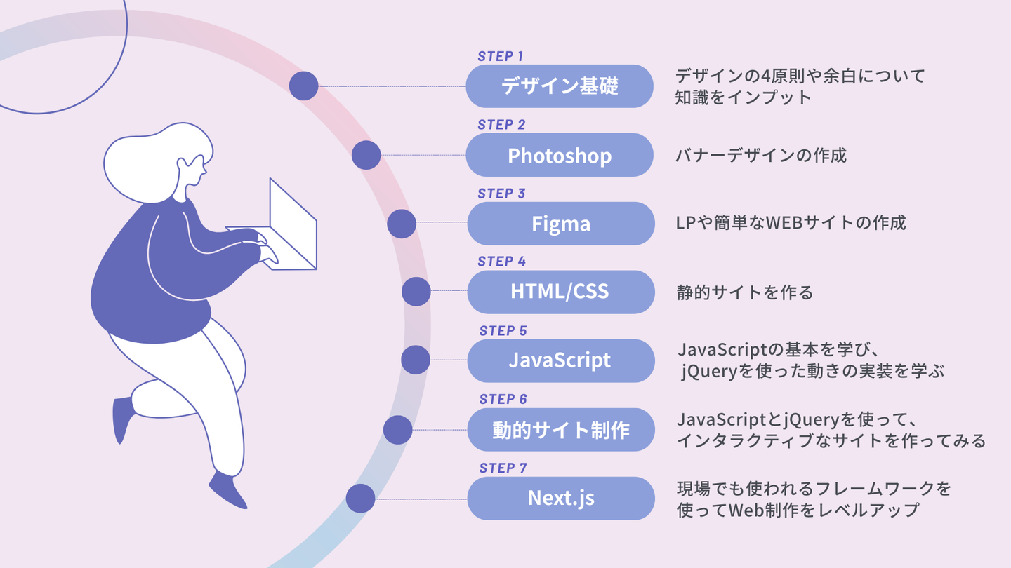 このように、「デザイン × コーディング」を段階的に学ぶことで、未経験からでも一人でWebサイトを企画・デザイン・実装できる力を身につけることができます。