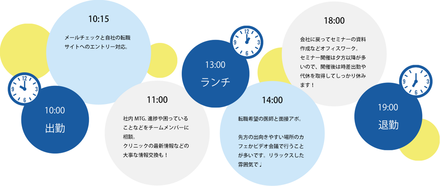 まずは業界知識がない先生に美容医療の市場について解説するところからスタート。単純に今のスキルと条件で転職できる所を紹介するのではなく、医師一人一人の目指す将来像をイメージして転職のお手伝いをできるのが他の人材紹介業との違いかな、と思います。
