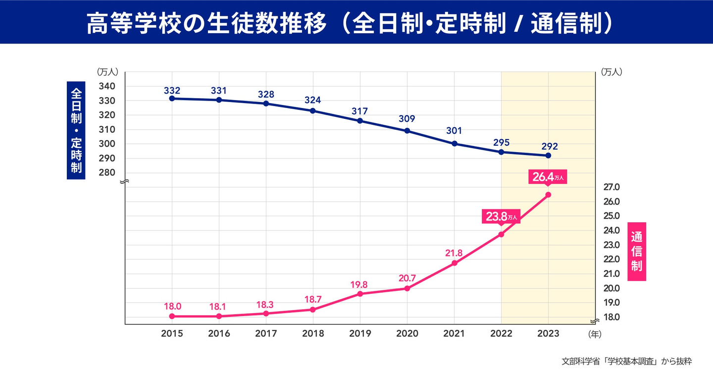 少子化が進む日本では、全日制・定時制の高校に通う生徒数は2015年から2023年にかけて約40万人減少しています。そんな状況の中、不登校の小中学生数の急激な増加などを背景に、通信制高校に通う生徒は年々増加しており、2023年は26万人を上回る結果となりました(※1)。急増する通信制高校のニーズを受け、多様な選択肢が求められています。