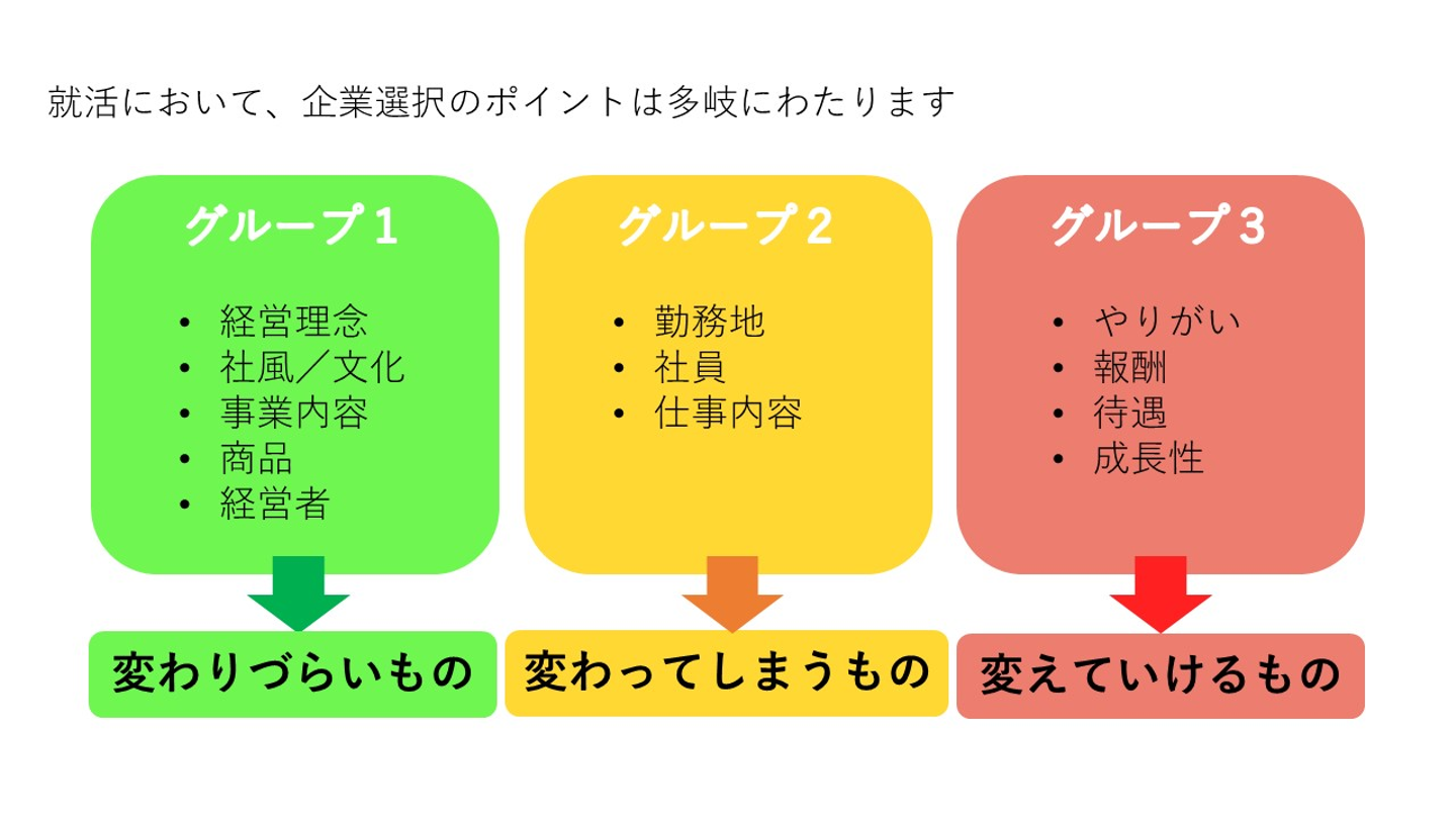という、会社選びのポイントについて説明がありました。企業選択のポイントは大きく分けて3つのグループに分けられるそうです。(下図参照)