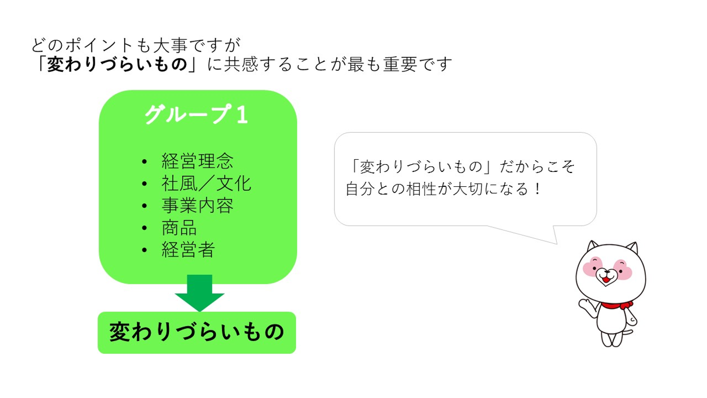 企業を構成する要素は多岐にわたりますが、その中でも「経営理念」「社風/文化」といった 変わりづらいもの に共感できるかが、ポイントです。