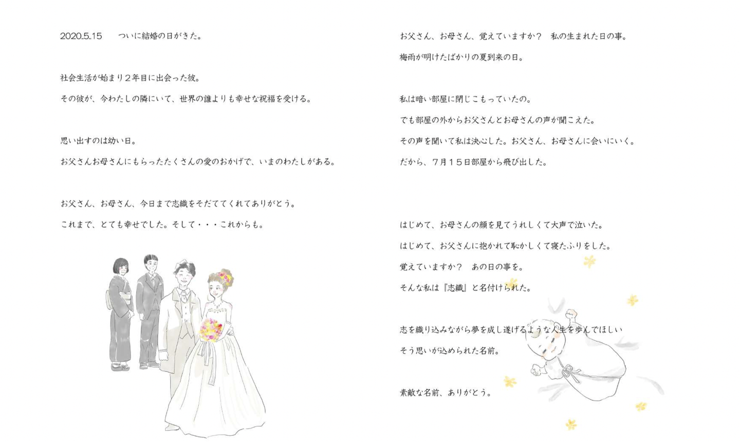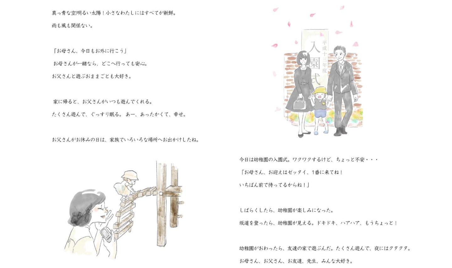 伝えたい思いや、過ごした思い出などをヒアリングし、専属の脚本家・プロのイラストレーターにより、物語とイラストをお客様に合わせて書き起こした世界にたった1つだけのオリジナル絵本です。