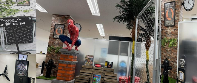 入り口では等身大のスパイダーマンがお出迎え!休み時間にはオフィス内にあるダーツ台で真剣勝負!非常に居心地の良いオフィスです。