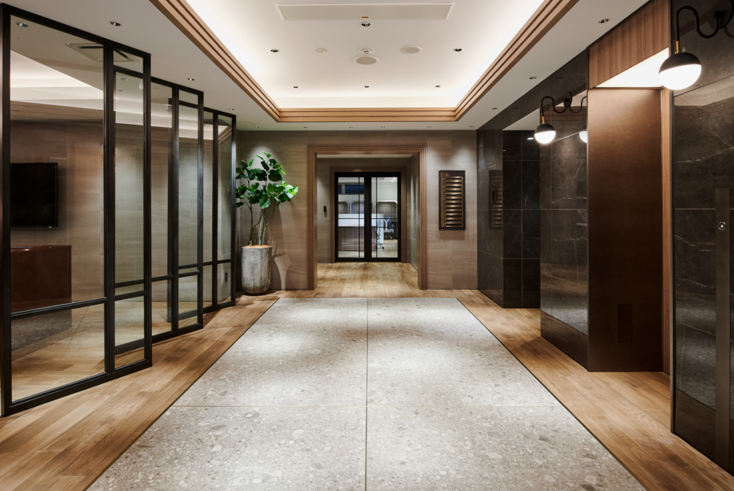 こちらの1階エントランスから、エレベーターで12Fまで上がったらオフィスです