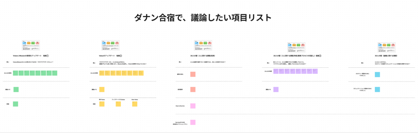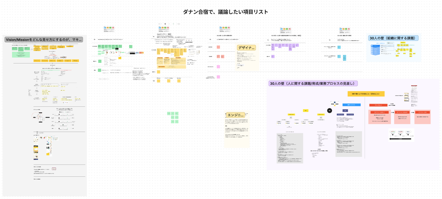 今回の合宿では、下記FigJamに用意した項目について全て議論して、30人の壁を乗り越えるための現時点での自分達の”こたえ”を書くことができれば、合宿のゴールを達成したということにしました。