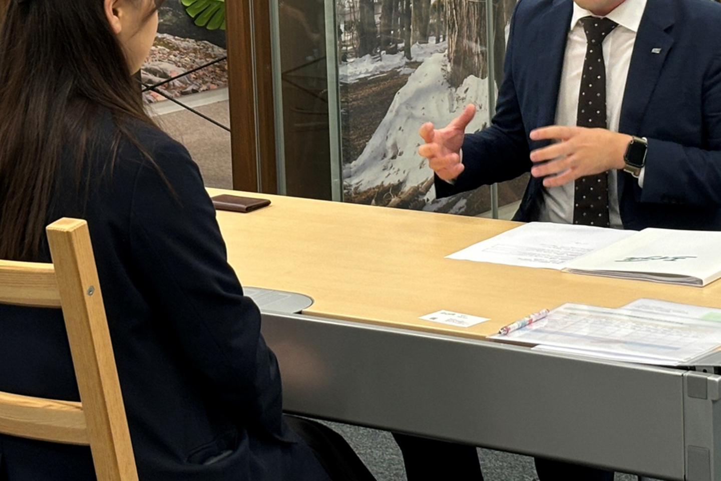 審査員である各営業部長の前で、「転勤で一人暮らし」のお客様という想定で接客を行います。転勤だからこそ、どんなことをサポートしたほうがいいのか?いろいろなパターンを想定したうえで、お話を進めます!