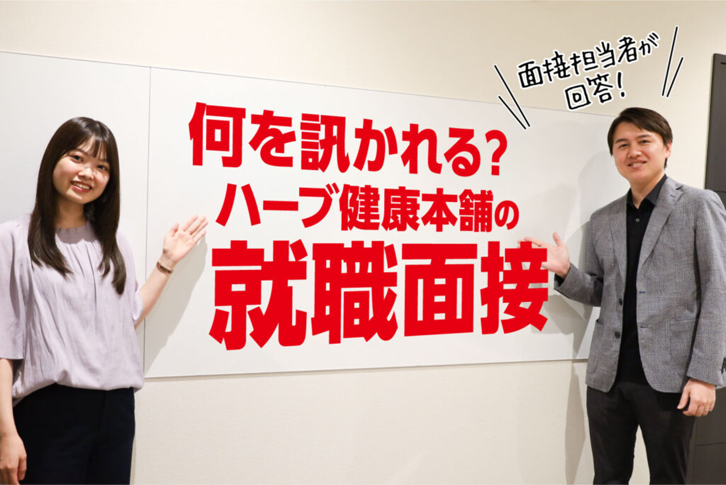就職面接のお悩みに少しでもお力になれるよう、ハーブ健康本舗の現役人事である山川・高原が立ち上がります。面接担当官として、日々多くの面接の現場に立ち合うふたりが、ハーブ健康本舗の就職面接について解説!
