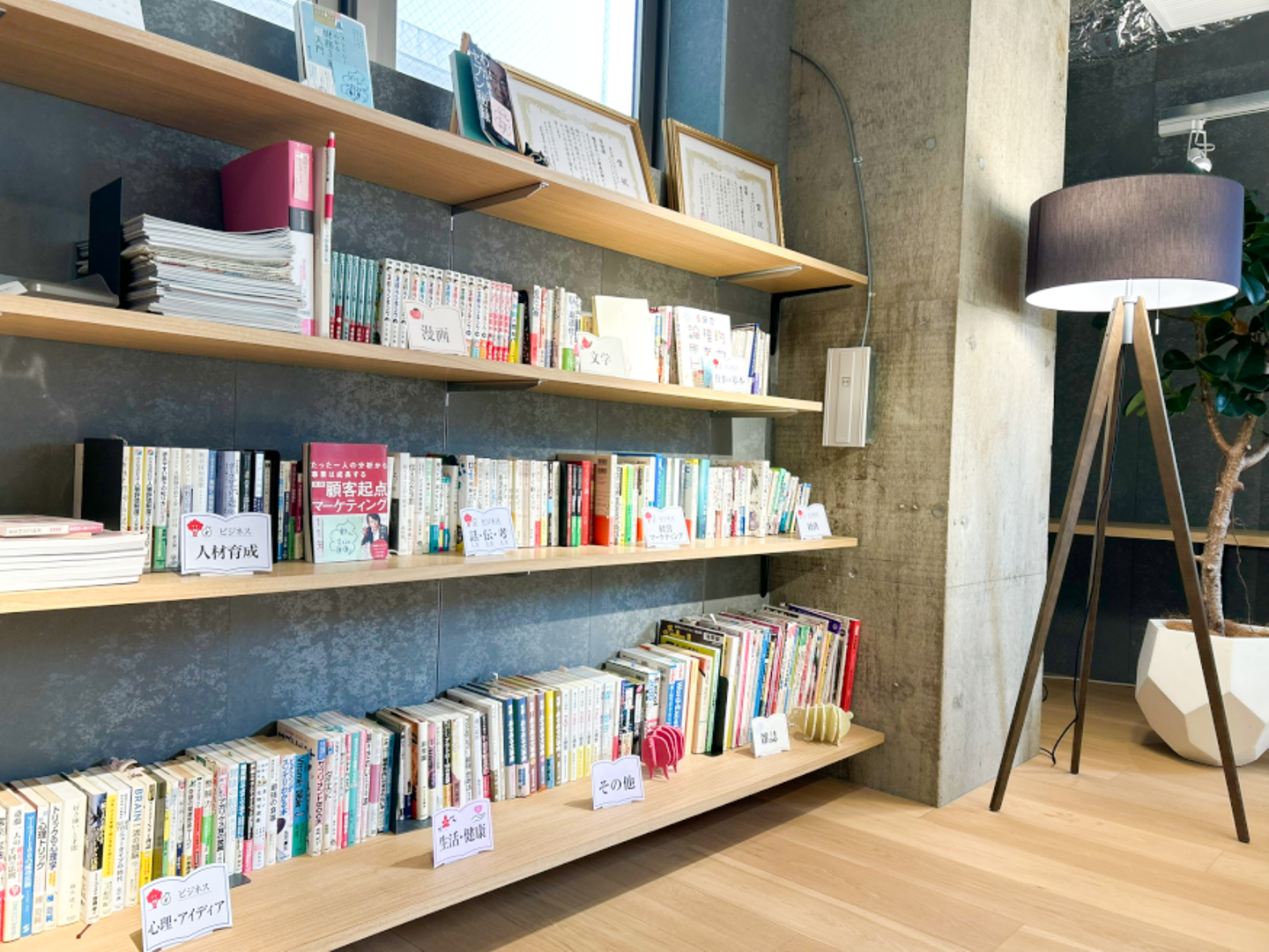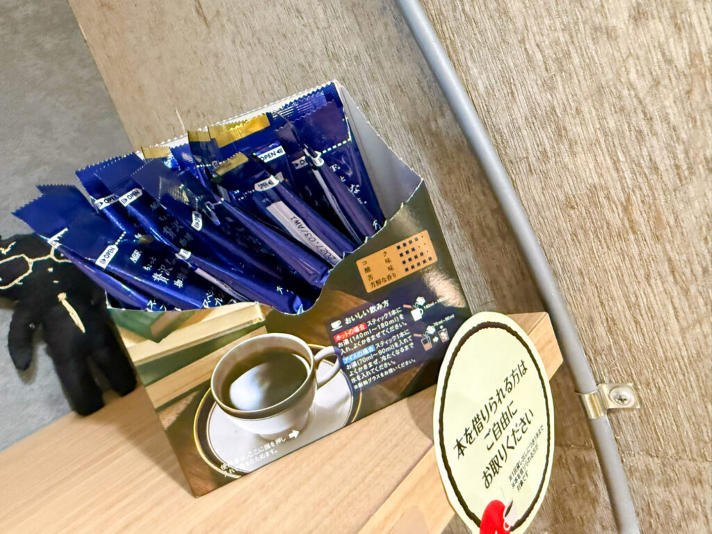 ハーブ図書があるのは、3階の休憩スペース。本を借りたメンバーがそのまま休憩スペースでゆっくり読書を楽しめるよう、2025年10月末から、本の貸出1冊につき、スティックタイプのコーヒーを1本プレゼントする取り組みがはじまりました。