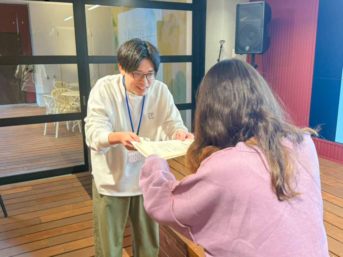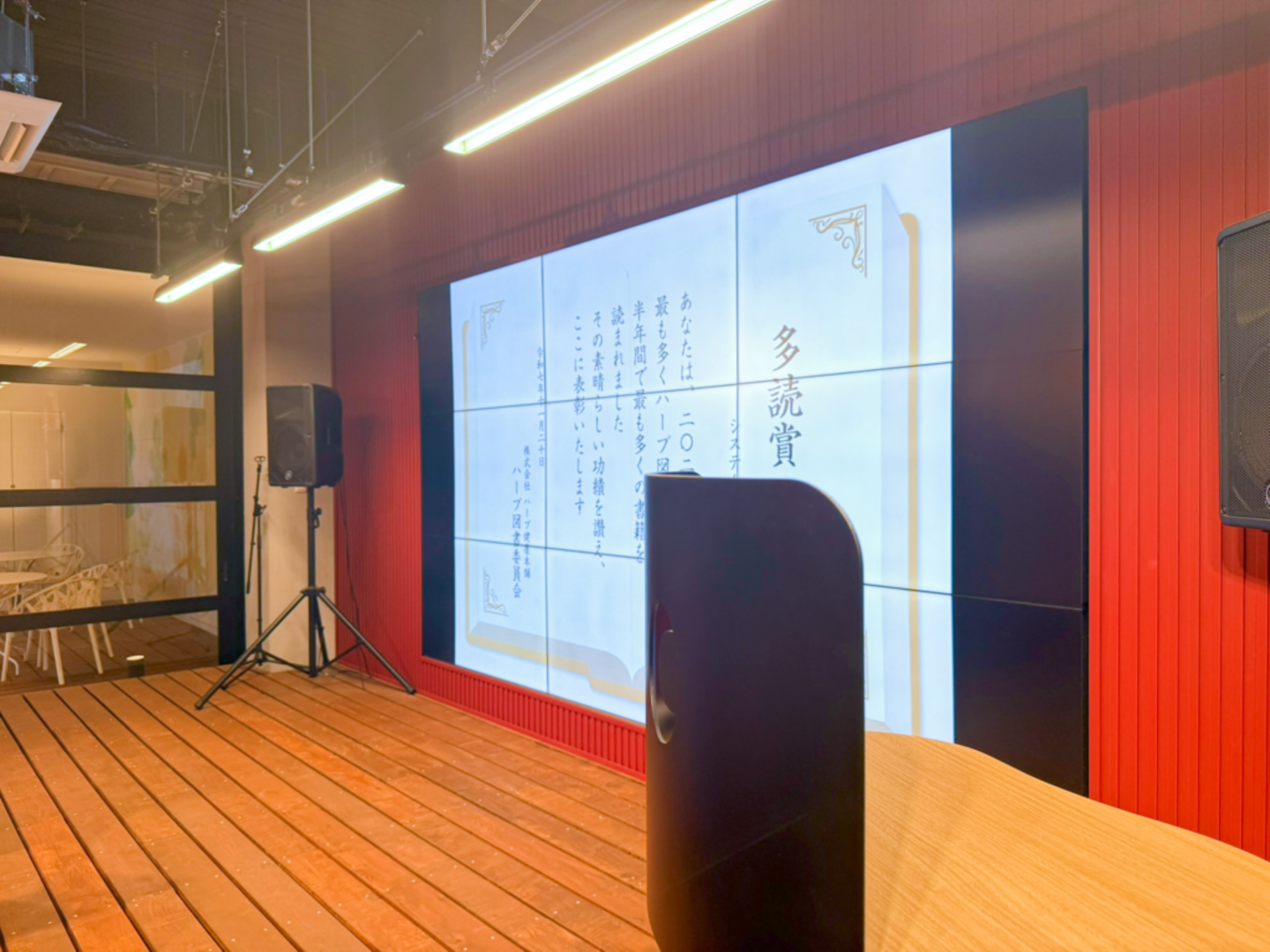 5階のカフェスペースにて執り行われた多読賞の委員長の江崎から表彰状の授与と、副賞として図書カード2000円分が贈呈されました。