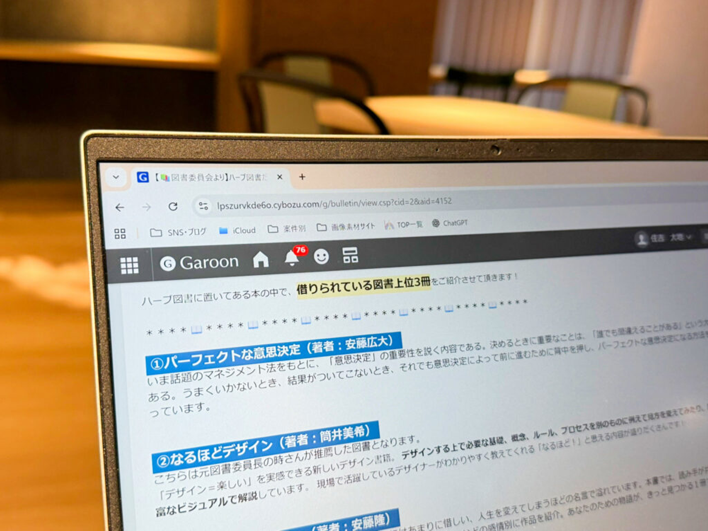 「本を置いてくれてありがとう」と個別にチャットでメッセージをもらった際は嬉しかったです。「最近入荷してもらった本、実は私の好きな本なんですよ」と社内で声をかけてくださる方もいて、活動のモチベーションになっています。