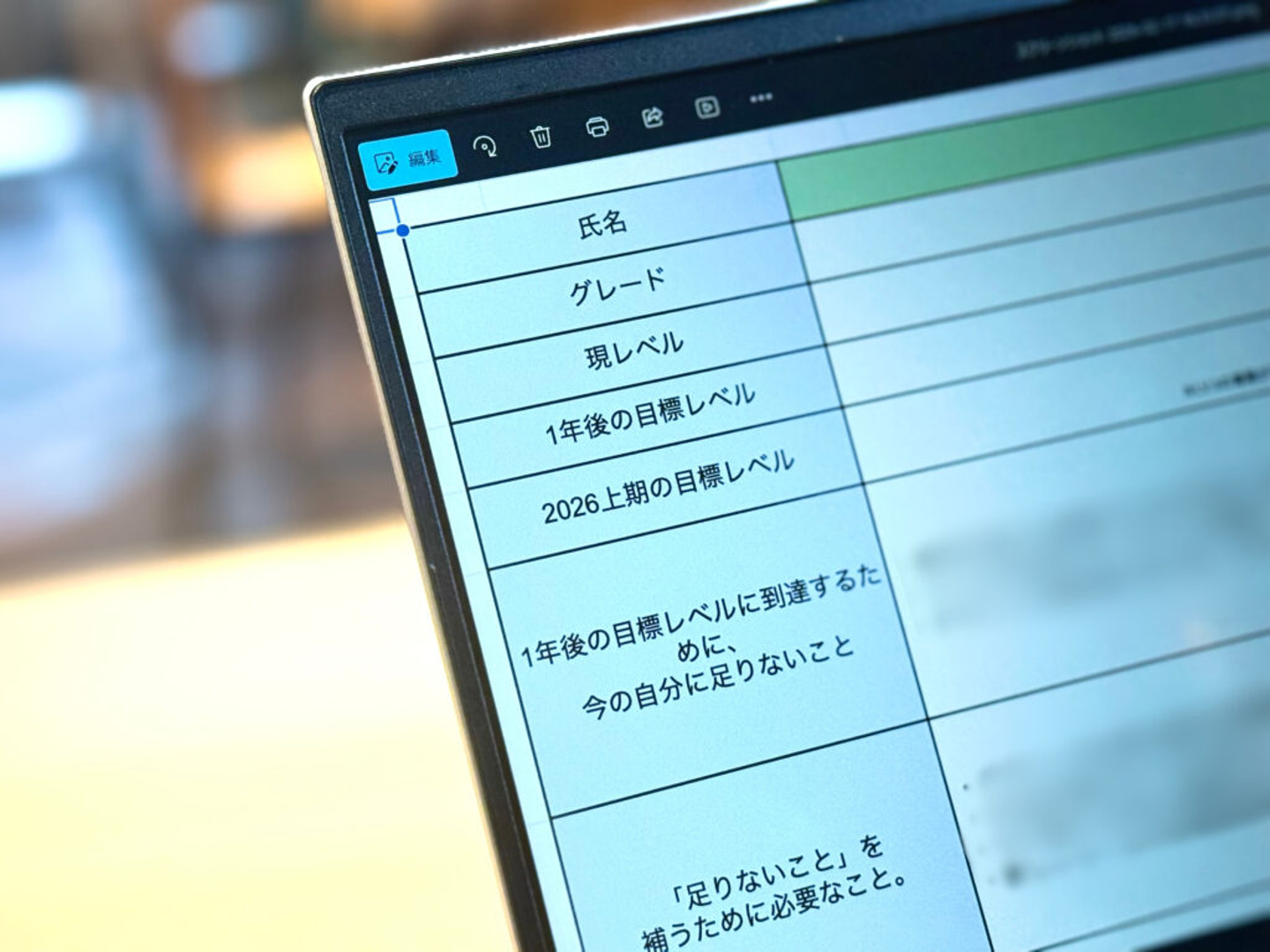 目指すべきゴールとやるべきことをメンバー自身が言葉にして書き出せる「成長シート」のひな形を作成し、2年前から運用をはじめています。常に内容を見直し、ブラッシュアップしながら現在のフォーマットが完成しました。メンバーとの面談時は、提出してもらった成長シートの取り組み状況を一緒に振り返り、必要に応じてフィードバックをしています。
