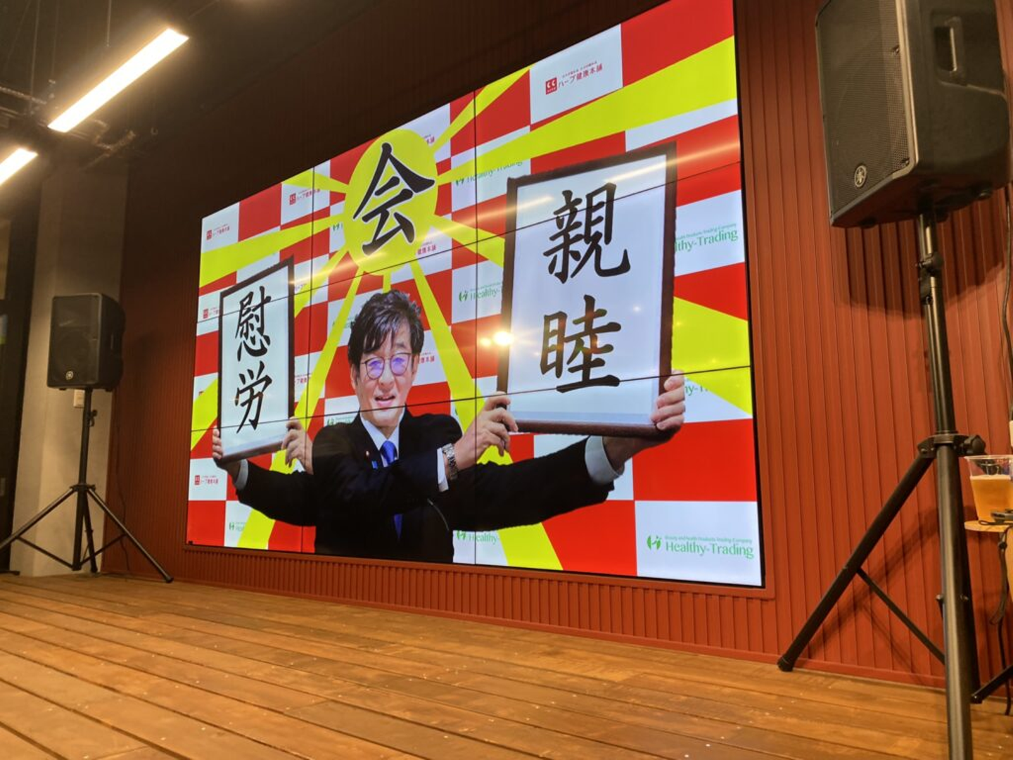ハーブ健康本舗の『慰労親睦会』について紹介する記事。 突然はじまる大画面ゲーム大会…面白い企画を実行できた幹事グループに賞金…改めてみてもクセが強い会社です!(笑)