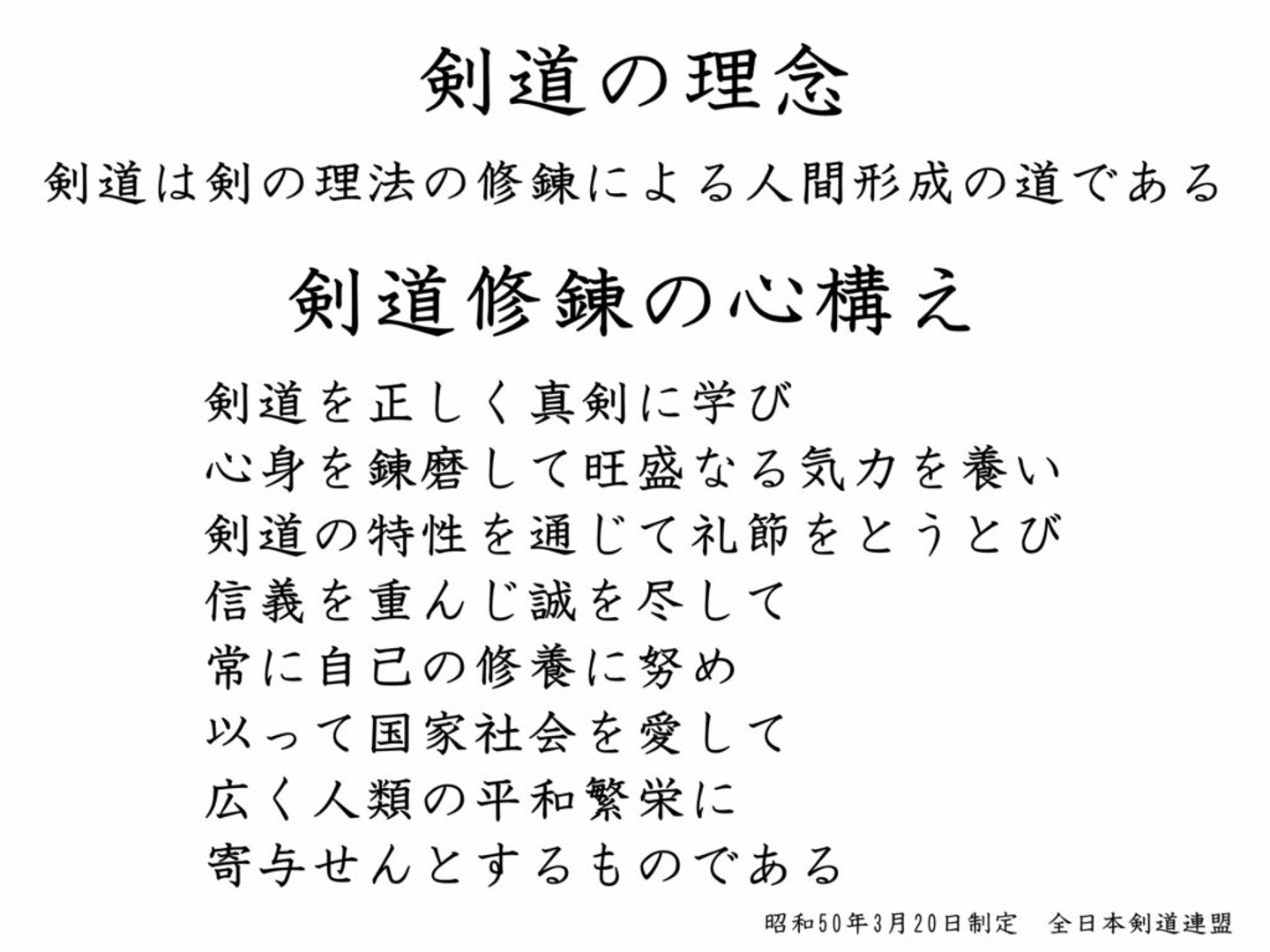 全日本剣道連盟は、剣道の本質を人間形成の道と表現し、理念として掲げています。