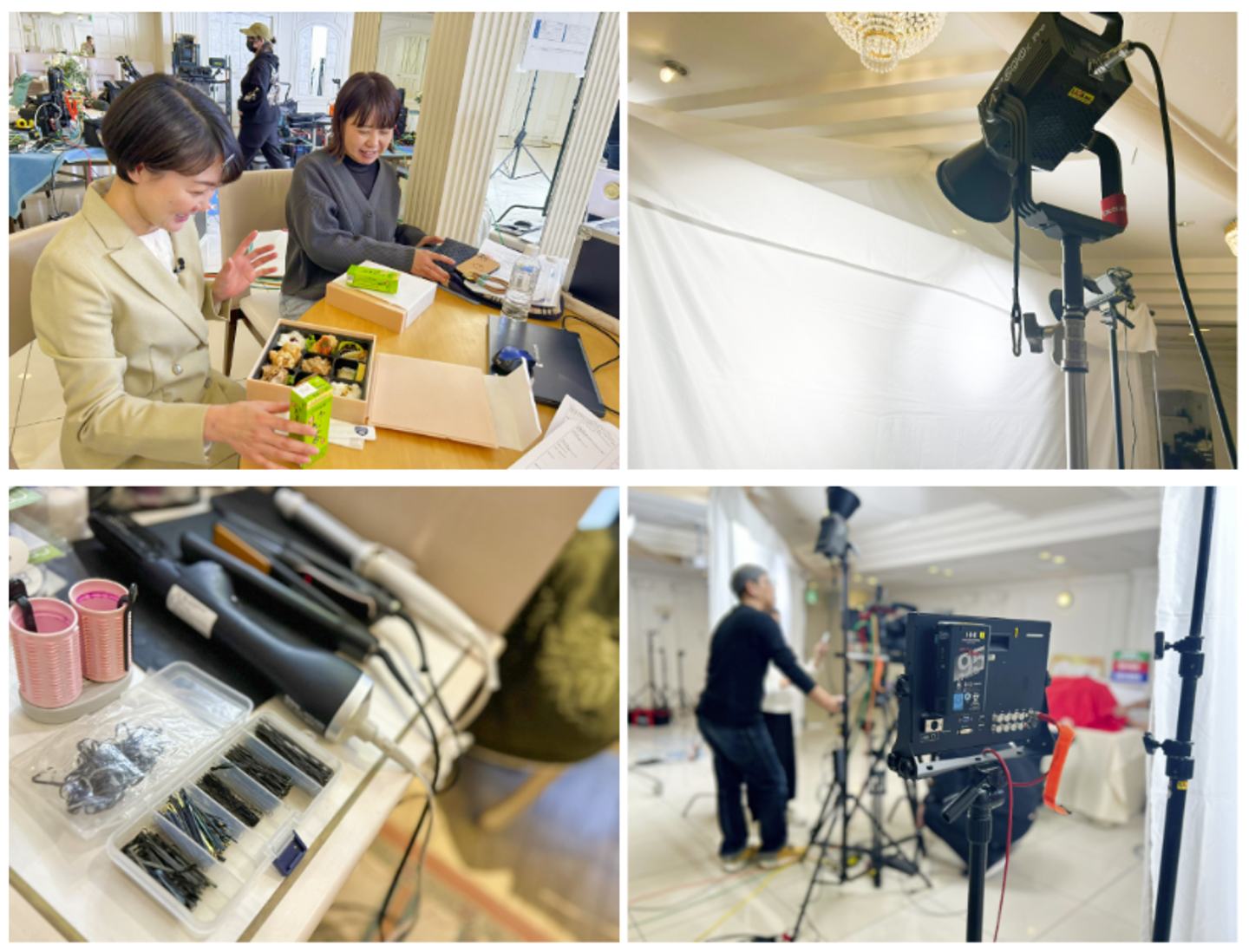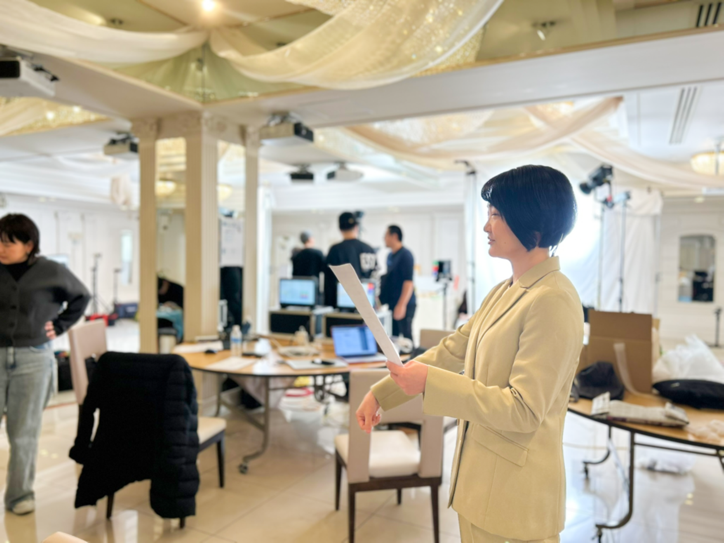 演者のヘアスタイルを整えつつ、いよいよ撮影本番。ぶっ通しではなく、細かくセリフを区切りながら、場面ごとにひとつずつ撮影が進行していきます。リハーサルで確認した通りの動きが精密に再現され、思わず「これがプロの仕事か…」と感嘆してしまいました。