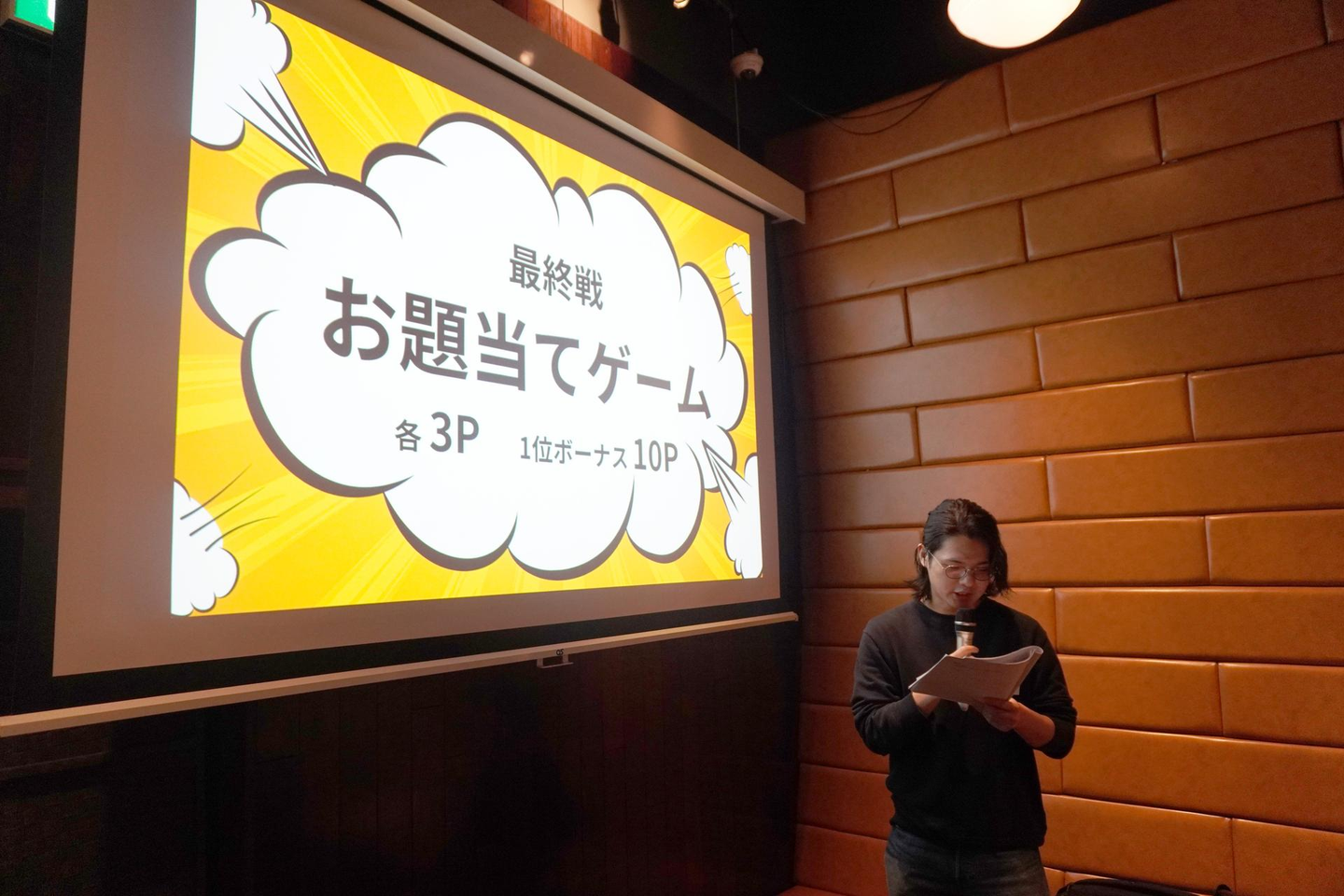 スクリーンに出したお題に関するヒントを出して、お題を当てるというゲームです!