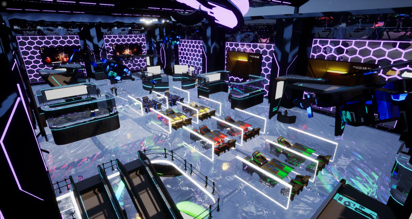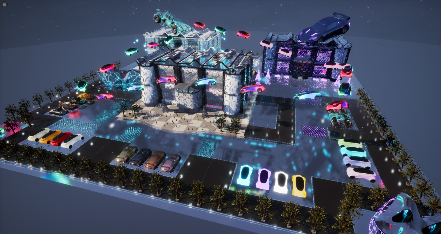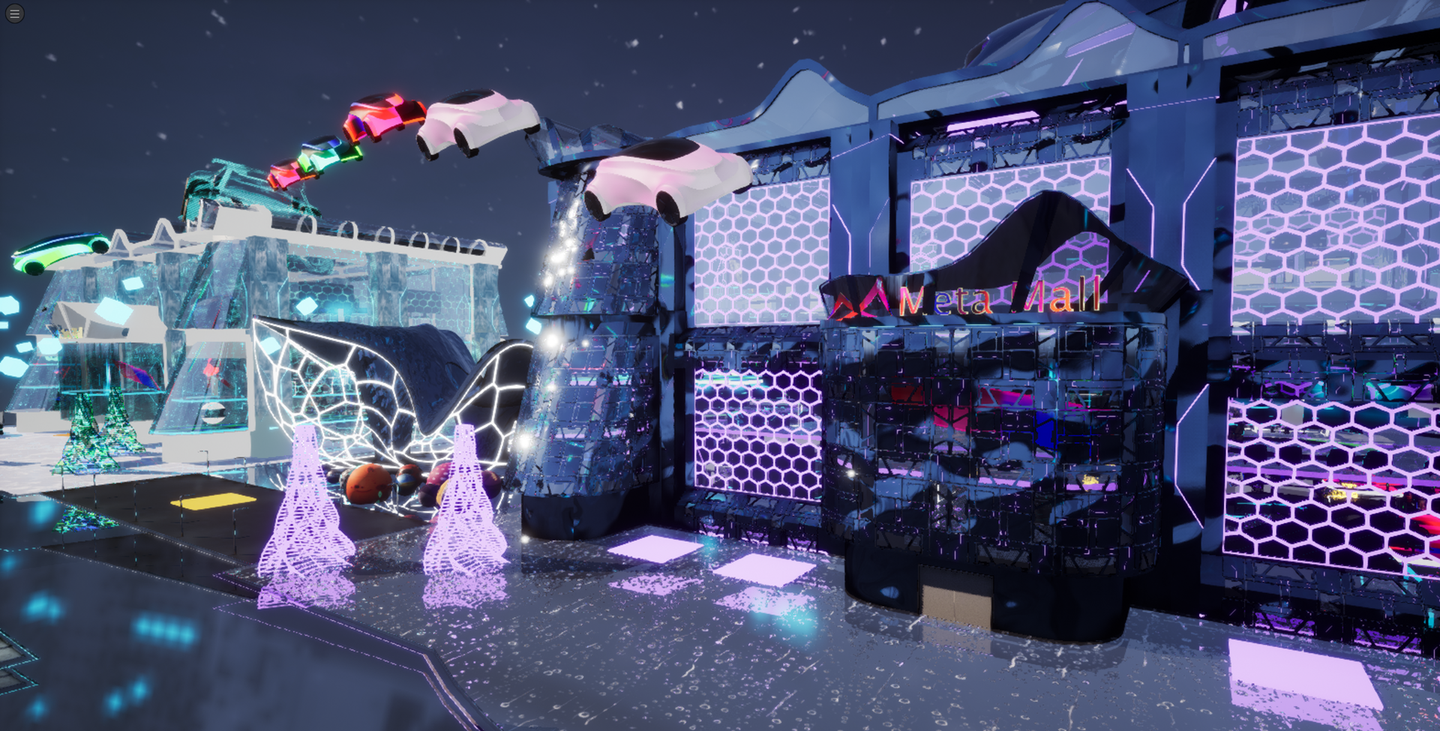 エンジニアユーザーを意識して、モールの中には巨大なゲーミングアイテムや、PC関連のアイテムを空中に配置しました(キーボード、ドローン、マイク、ワイヤレスイヤホンなど)