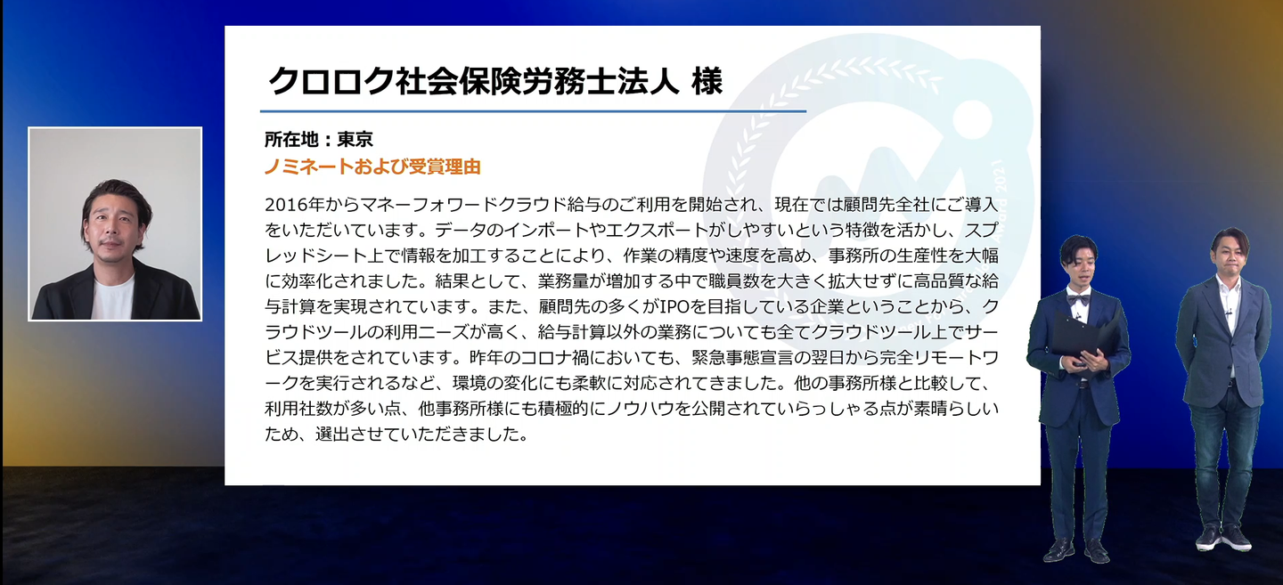 そのイベント内で「Money Forward Cloud Award 2021」というセッションがあり、その中で弊社(クロロク社会保険労務士法人)が「HR部門改革CHALLENGE賞」を受賞しました🎉