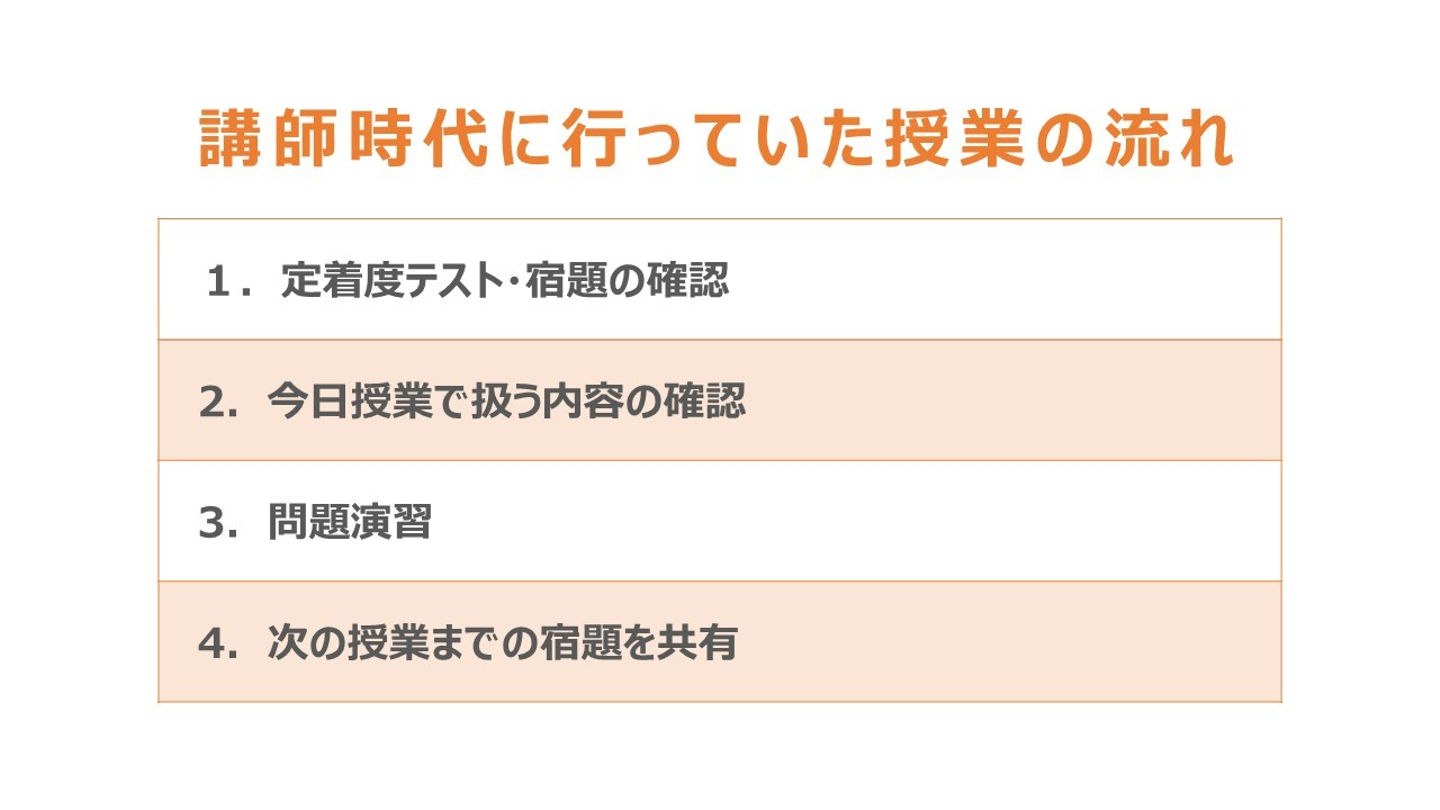 授業内容は、生徒や講師によって順番や内容が異なりますが、私はこういった流れで授業を進めていました!詳しく見ていきましょう!