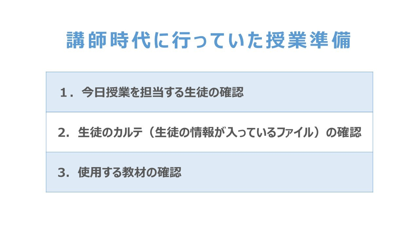カルテとは、生徒の情報が入っているファイルで、「どの単元を扱うのか」「どの教材を使用するのか」など授業に必要な情報が書かれているので、その情報から今日の授業内容を考えていきます。