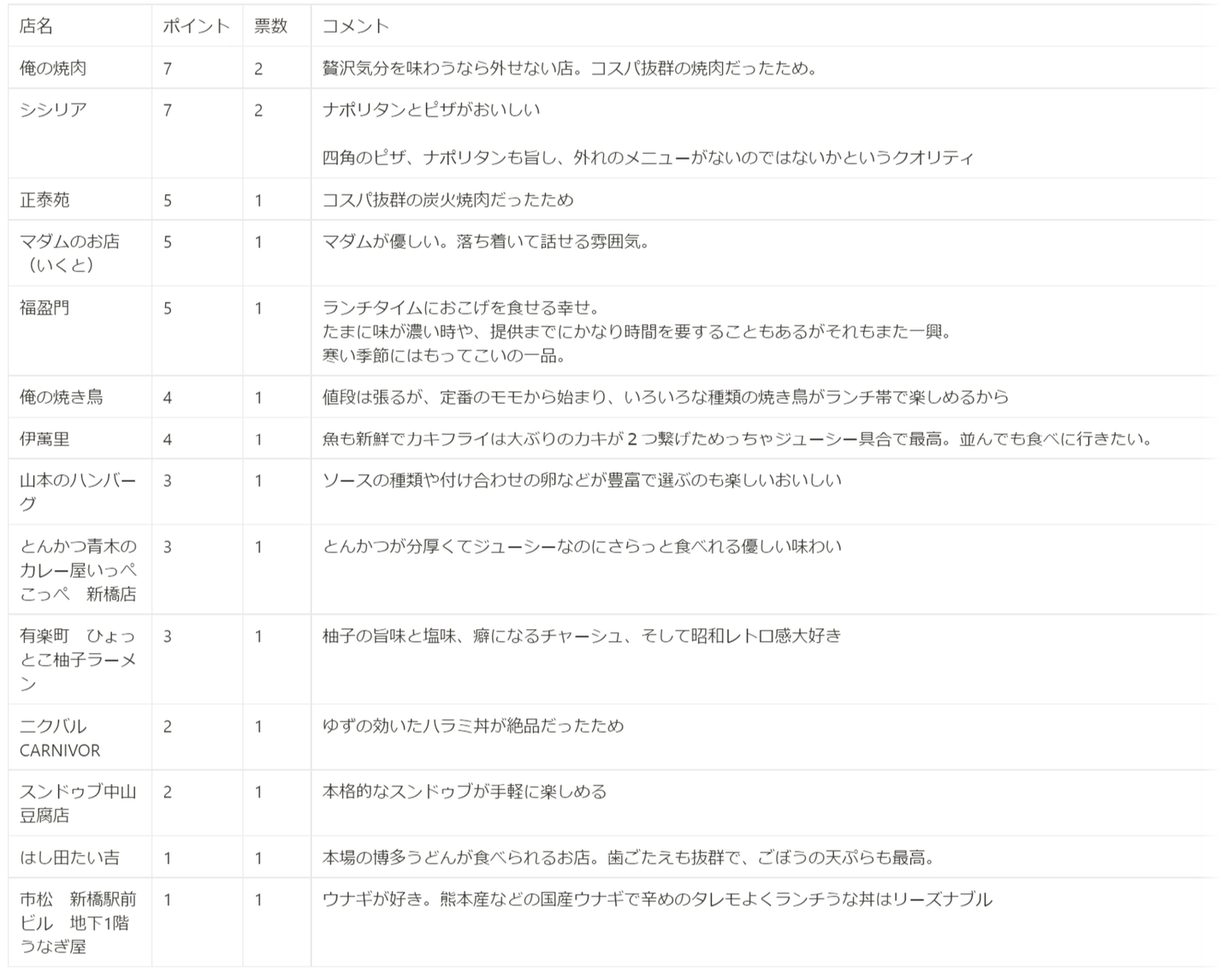 一人ひとりが1位から最大5位までよかったお店を回答し、1位5点、2位4点、3位3点、4位2点、5位1点で集計。