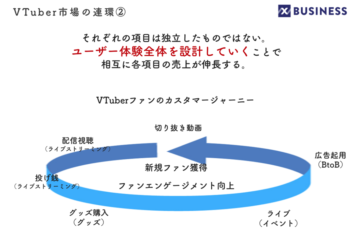 そういったファンの大きな熱気が伝わって企業広告にも起用されるようになり、その商品広告を見たVTuberを知らない方が、切り抜き動画からVTuberを知り…こういったカスタマージャーニー・ユーザー体験全体を設計していくことで、相互に各項目の売り上げが伸長させていくことになります。
