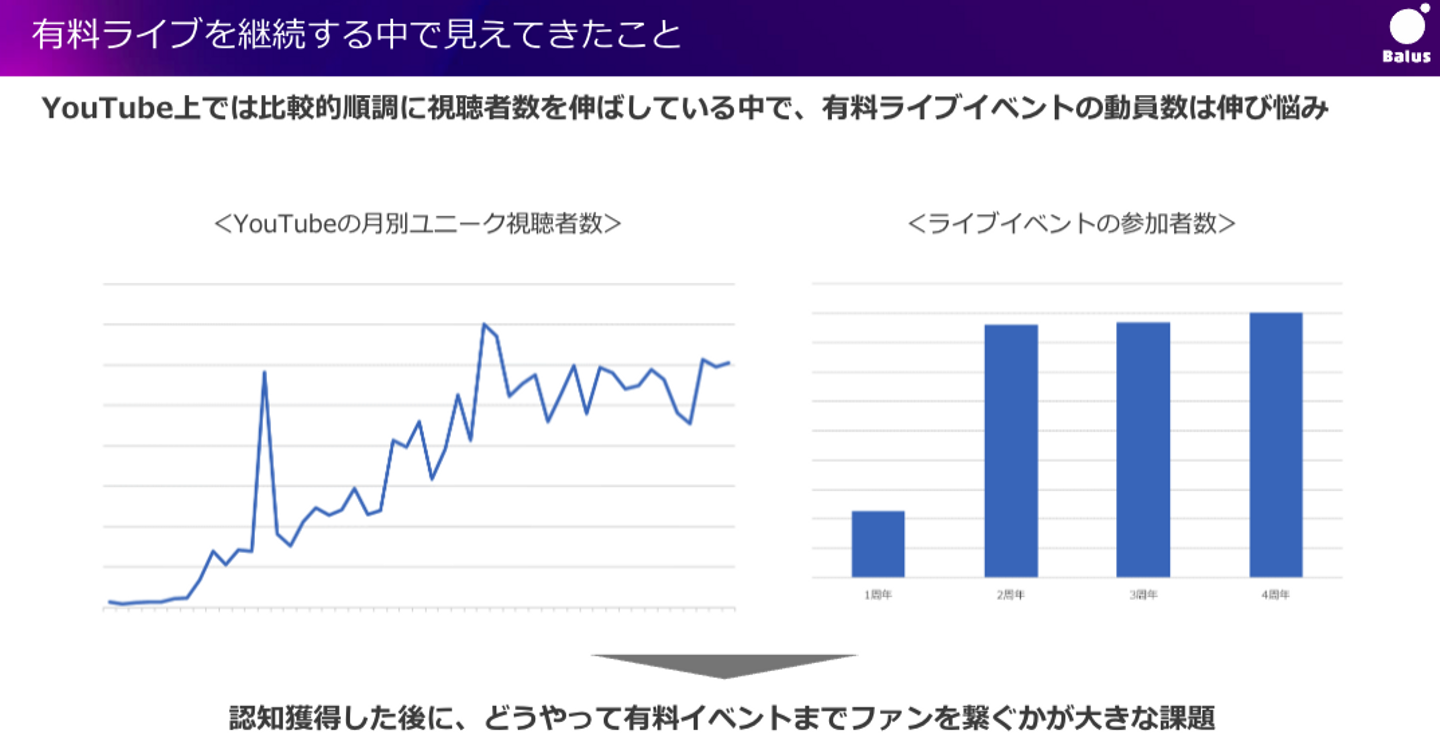 そんなタレントさんですが、YouTubeの月別ユニーク視聴者数は年々右肩上がりをつづけている一方で、ライブイベントの集客・参加数がここ数年横ばいになっていました。