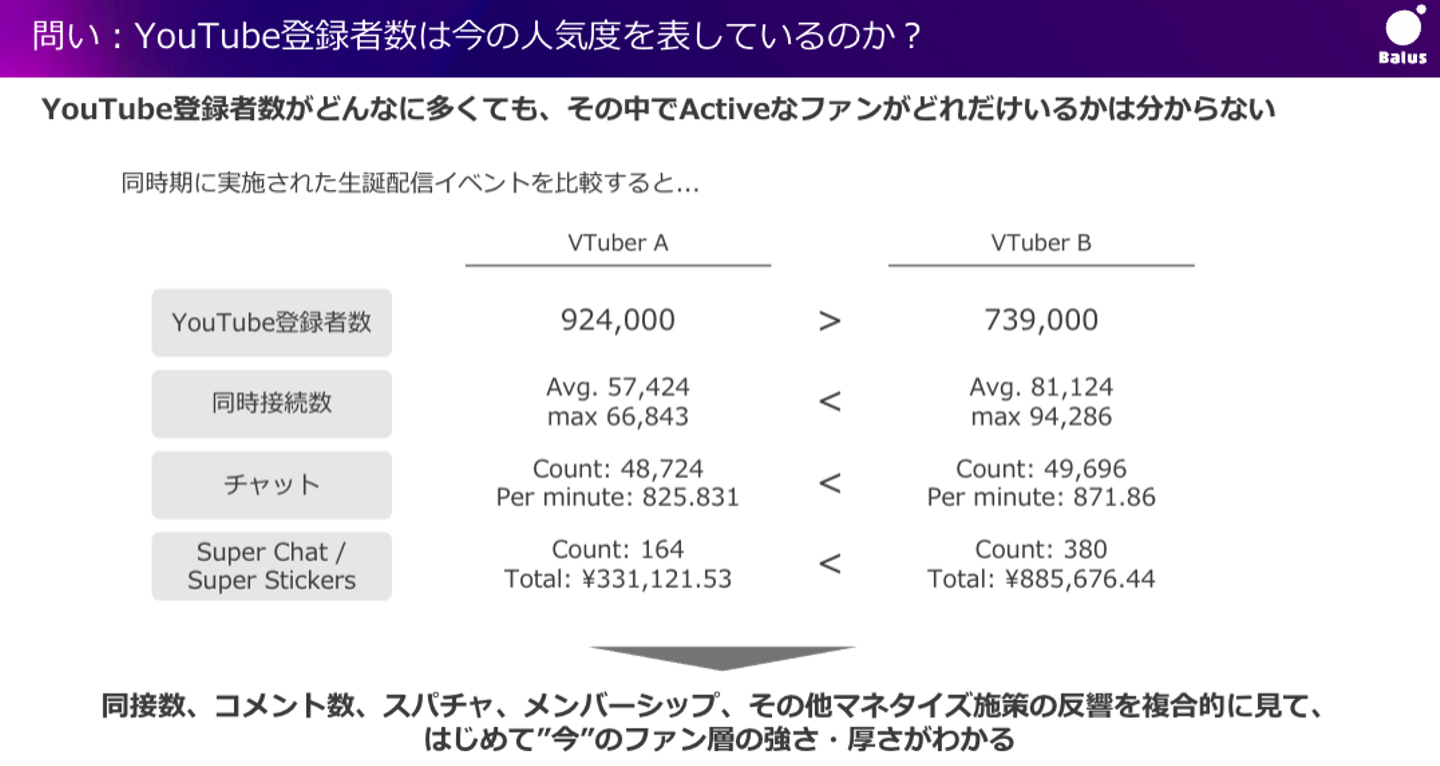 私たちバルスとしては、そういった側面をデータ分析を通して切り取るという考えをもっていて、“データ分析はファンとの対話の一つ”として捉えています。