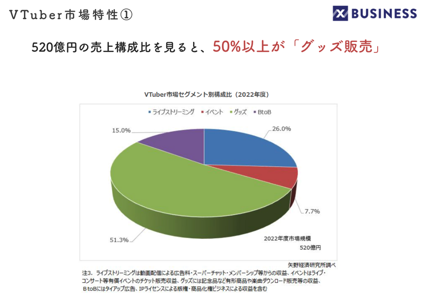 2022年度のVTuber市場は約520億円と計算されています。市場の内訳としては、ライブストリーミング・イベント・グッズ・BtoB、この4つの売上によって構成されています。