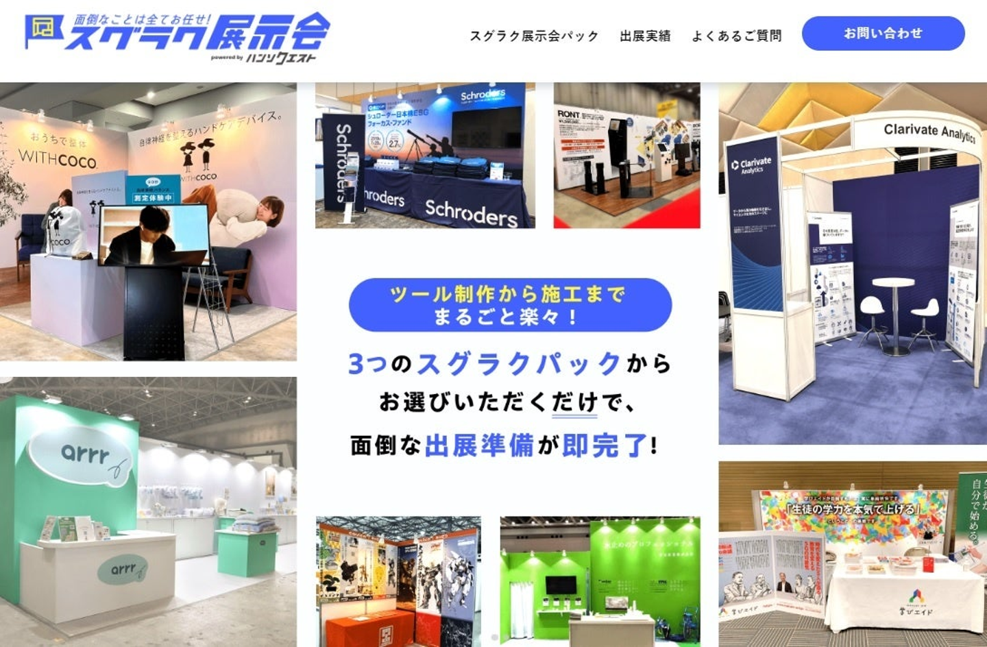 新サービス「スグラク展示会」は、ハンソクエストが従来提供していた展示会ブースのツール装飾制作に加え、<施工・撤収>までのブース制作において必要な全工程を含みメニュー化し一括でサポートするサービスです。
