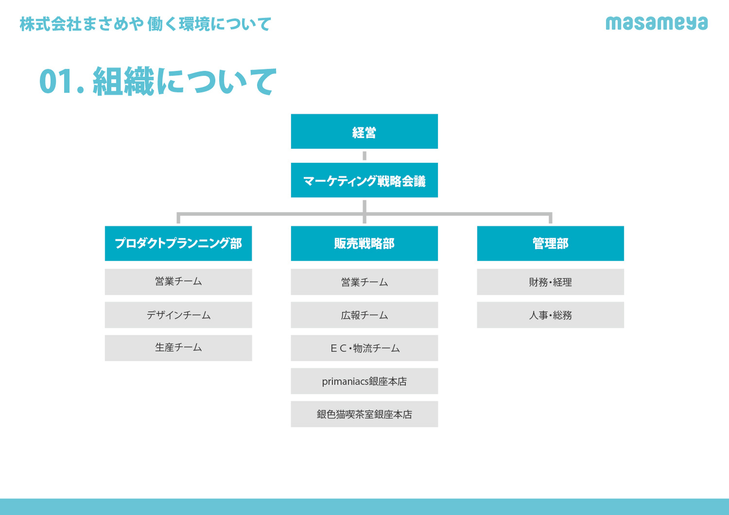 まさめやの組織は、商品の制作・生産に関わる「プロダクトプランニング部」、生産した商品の販売・流通に関わる「販売戦略部」、本部管理を行う「管理部」の3つから構成されています。