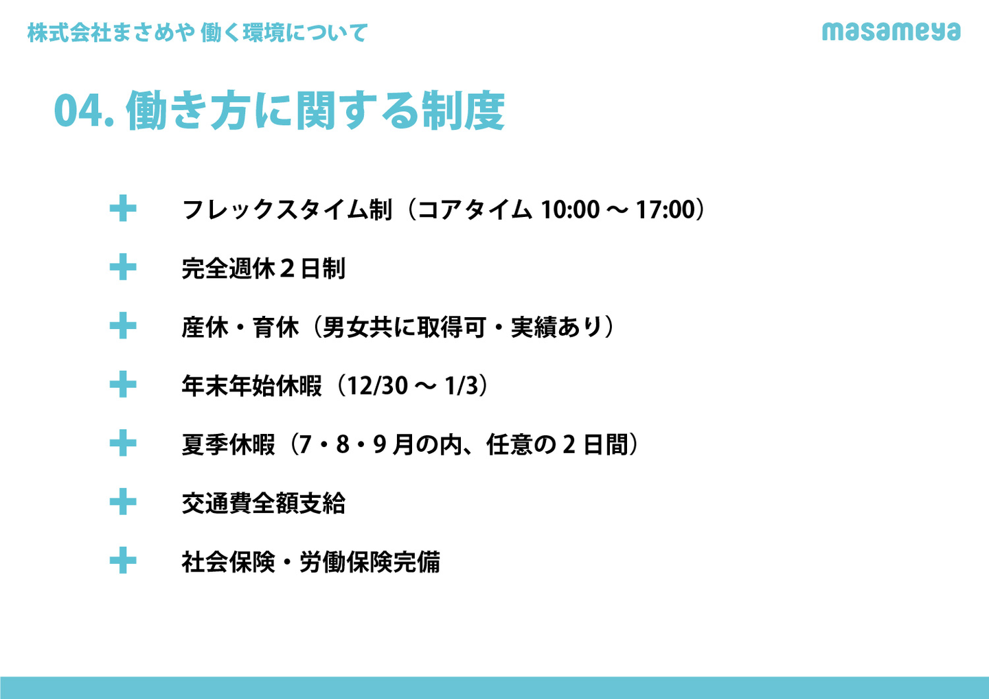 また、働きやすい環境作りのため、随時、様々な制度を積極的に導入しています(フレックスタイム制や、夏季休暇の取得日程の自由制など)