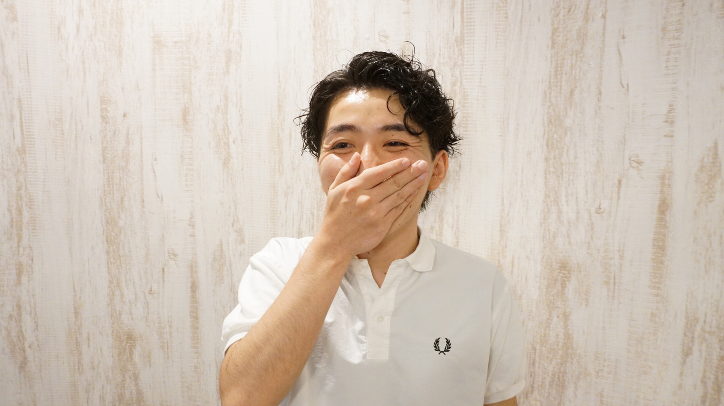 なかなか彼らしい写真が撮れずにいたところ、商品企画の朝原くんが緊張を解しに来てくれました。
