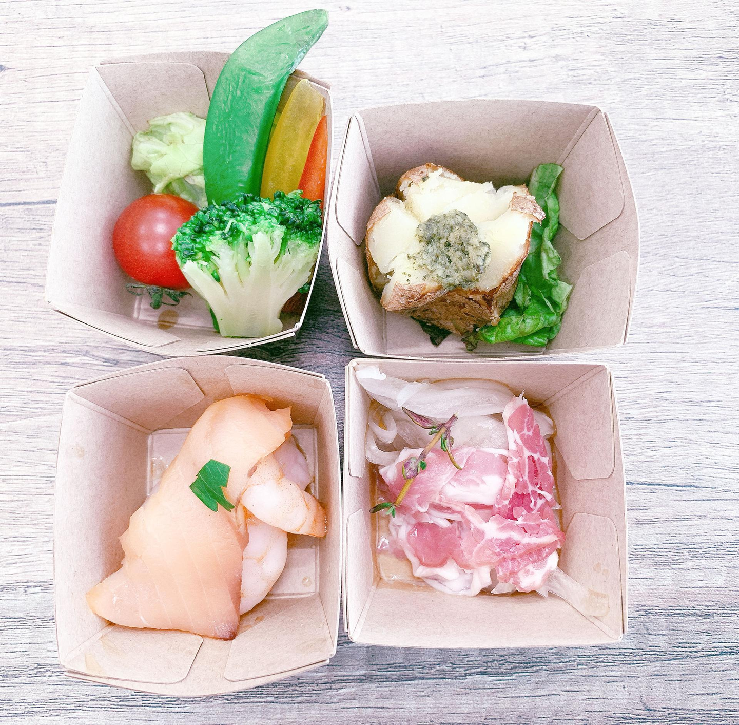 野菜やお肉など、色とりどりのオードブルが小分けになっているブッフェです。