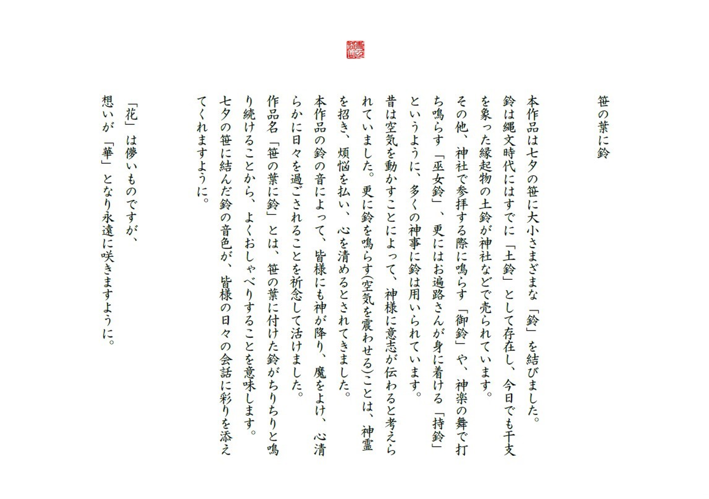 笹の葉に沢山の鈴が飾られているのは、魔除けや心清らかにという意味だけではなく、鈴の音色がおしゃべりをすることを意味するそうです。