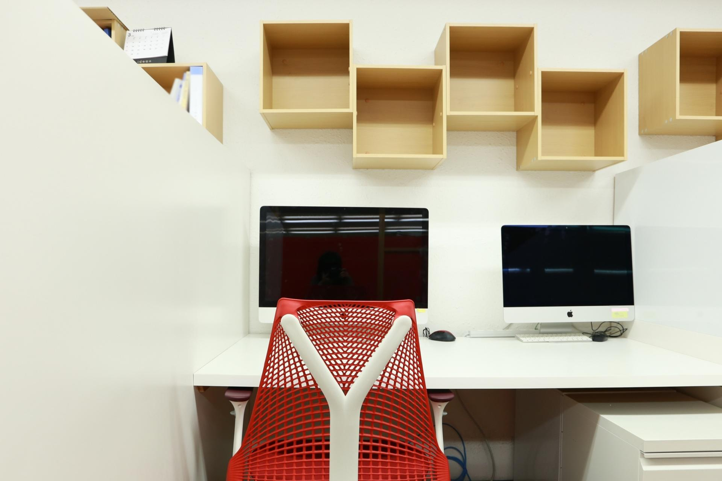 作業に必要なステーショナリーやデバイスももちろん会社に用意があります。撮影用の一眼レフカメラなど機材も揃っていますよ。こちらも白を基調とした明るい雰囲気です。