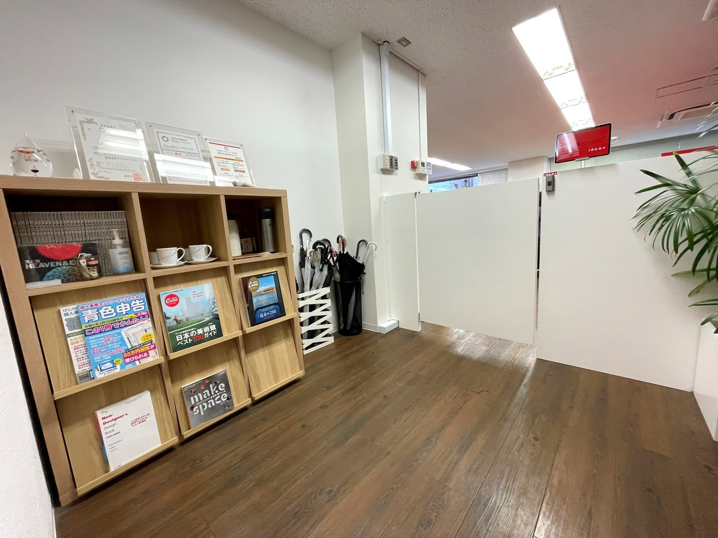 エントランスにはこれまでに取得した商標登録や受賞した賞状などを展示していますので、来社された際はぜひチェックしてみてくださいね。デザインや広告に関わる雑誌も置いていて、誰でも読むことができます。