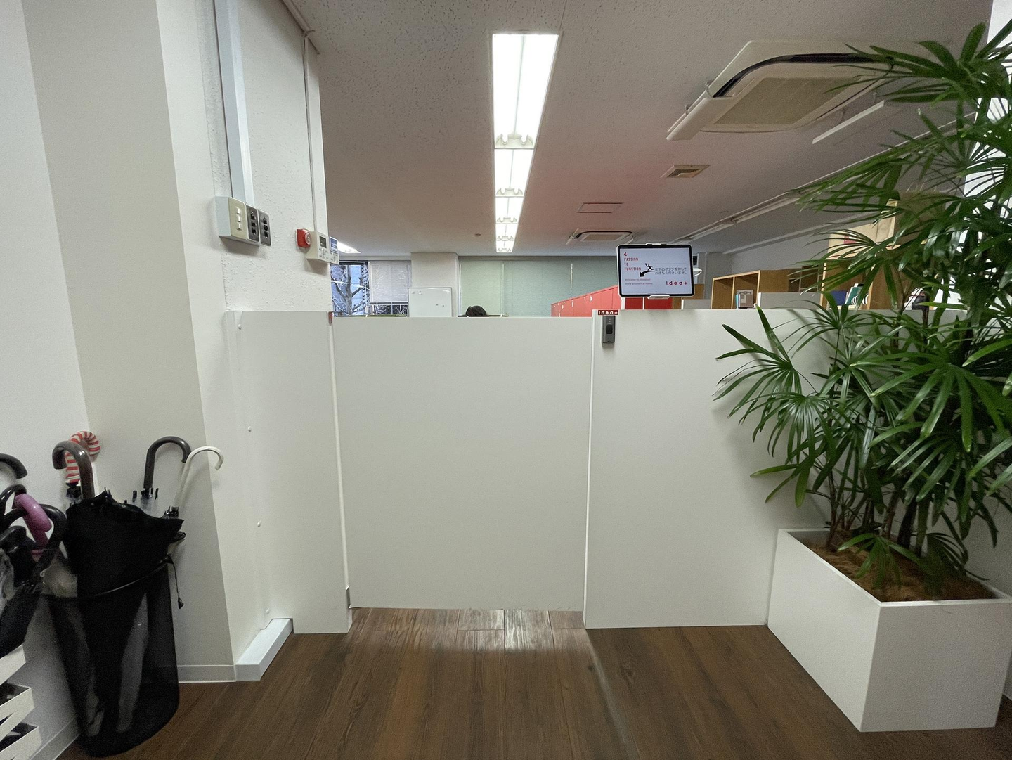 出社時は、この扉を抜けてオフィスフロアへ。来客時は備え付けのタブレットから担当者を呼び出すことができます。社内を見渡せるゲートをつけることで、開放感を保ちながら空間を仕切っています。観葉植物はオフィスのさまざまな場所にある癒やしアイテムです♪