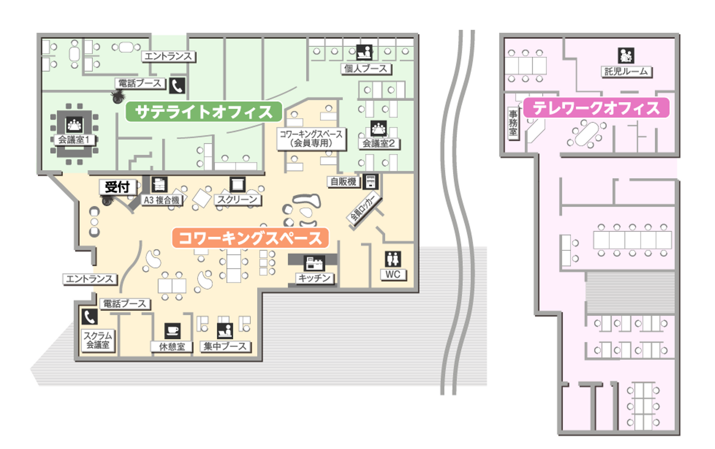 施設内には、本社以外の勤務拠点として法人が入居する「サテライトオフィス」、オフィス環境をシェアしながら働ける「コワーキングスペース」、企業から受託した業務にテレワークで従事するための「テレワークオフィス」の3つのエリアがあります。