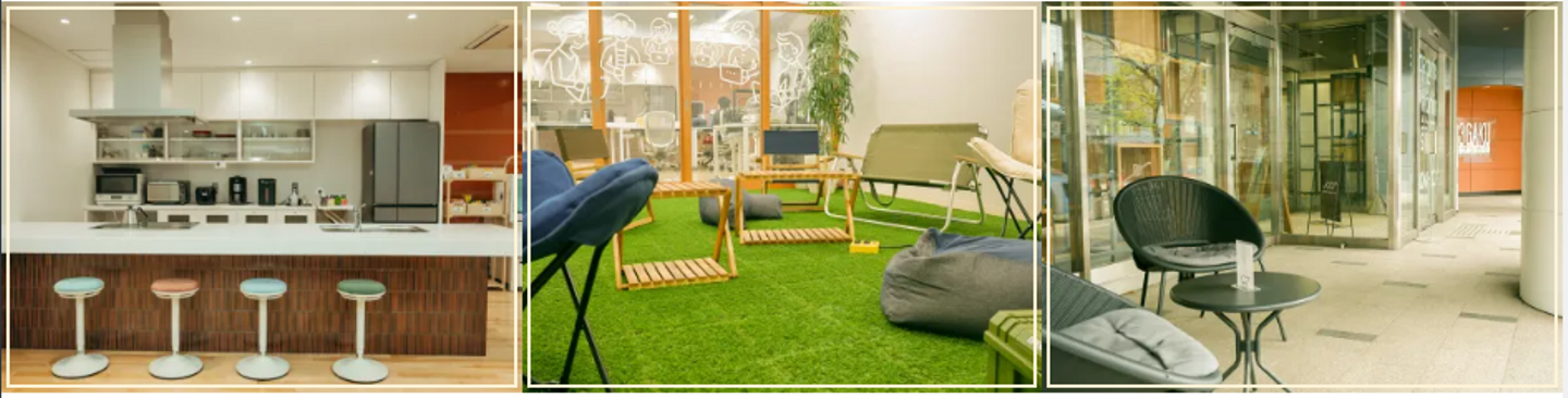 芝のカーペットを引いたコミュニティスペースは、のんびり過ごしたりアイデアを練ったりするのにおすすめの室内アウトドア空間。誰でも好きなときに使えます。